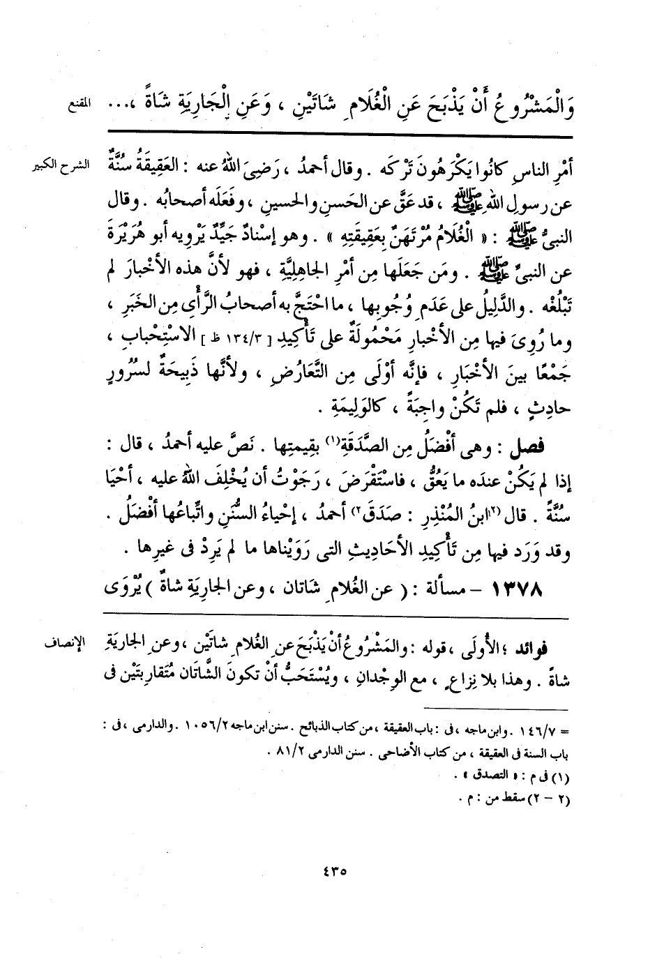فوائد؛ الأُولَى، قوله: والمَشْرُوعُ أنْ يَذْبَحَ عنِ الغُلامِ شاتَيْن، وعنِ الجاريَةِ شاةً. وهذا بلا نِزاعٍ، مع الوِجْدانِ، ويُسْتَحَبُّ أنْ تكونَ الشَّاتَان مُتَقارِبتَيْن فى