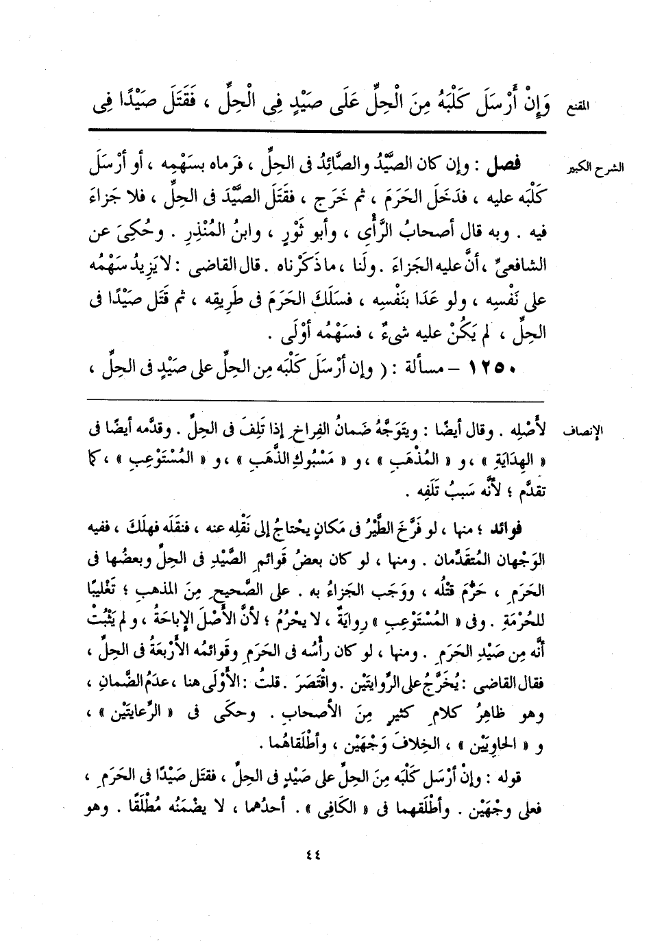 قوله: وإنْ أرْسَل كَلْبَه مِنَ الحِلِّ على صَيْدٍ فى الحِلِّ، فقتَل صَيْدًا فى الحَرَمِ، فعلى وجْهَيْن. وأطْلَقهما فى «الكَافِى». أحدُهما، لا يضْمَنُه مُطْلَقًا. وهو