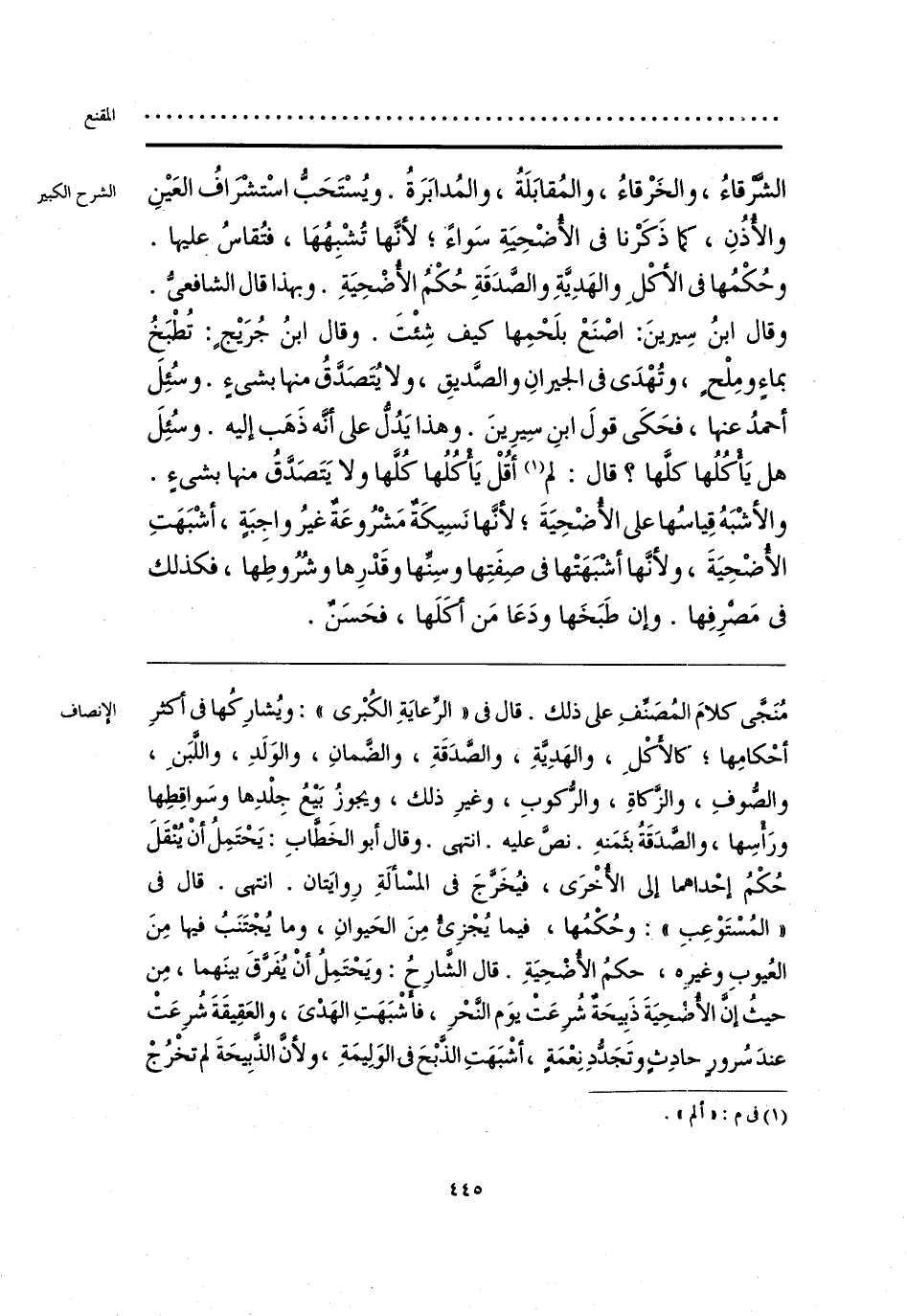 مُنَجَّى كلامَ المُصَنِّفِ على ذلك. قال فى «الرِّعايَةِ الكُبْرى»: ويُشارِكُها فى أكثرِ أَحْكامِها؛ كالأَكْلِ، والهَديةِ، والصَّدَقَةِ، والضَّمانِ، والوَلَدِ، واللَّبَنِ، والصُّوفِ، والزَّكاةِ، والرُّكوبِ، وغيرِ ذلك، ويجوزُ بَيْعُ جِلْدِها وسَواقِطِها ورَأْسِها، والصَّدَقَةُ بثَمَنهِ. نصَّ عليه. انتهى. وقال أبو الخَطَّابِ: يَحْتَمِلُ أنْ يُنْقَلَ حُكْمُ إحْداهما إلى الأُخْرَى، فيُخَرجَ فى المسْأَلَةِ رِوايَتان. انتهى. قال فى «المُسْتَوْعِبِ»: وحُكْمُها، فيما يُجْزِئُ مِنَ الحَيوانِ، وما يُجْتَنَبُ فيها مِنَ العُيوبِ وغيره، حكمُ الأُضْحِيَةِ. قال الشَّارِح: ويَحْتَمِلُ أنْ يُفَرقَ بينَهما، مِن حيثُ إنَّ الأُضْحِيَةَ ذَبِيحَة شُرِعَتْ يوَم النَّحْرِ، فأَشْبَهَتِ الهَدْى، والعَقِيقَةَ شُرِعَت عندَ سُرورٍ حادِثٍ وتَجَدُّدِ نِعْمَة، أشْبَهَتِ الذَّبْحَ فى الوَلِيمَةِ، ولأنَّ الذَّبِيحَةَ لم تخْرُجْ