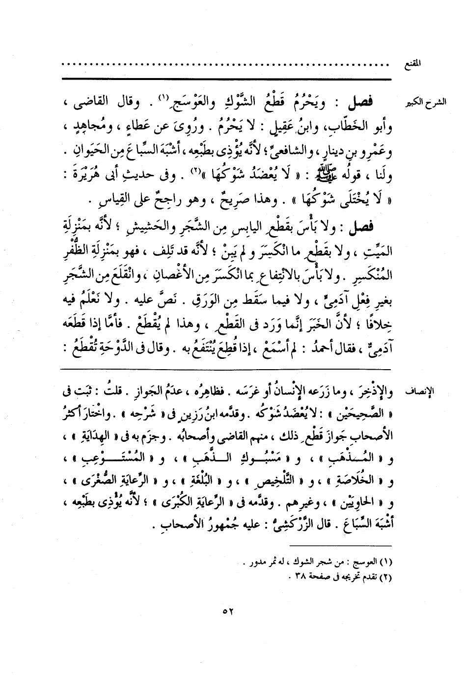 والإذْخِرَ، وما زَرَعه الإنْسانُ أو غرَسَه. فظاهِرُه، عدَمُ الجَوازِ. قلتُ: ثبَت فى «الصَّحِيحَيْن»: لا يُعْضَدُ شَوْكُه. وقدَّمه ابنُ رَزِين فى «شَرحِه». واخْتارَ أكثرُ الأصحابِ جَوازَ قَطْعِ ذلك، منهم القاضى وأصحابُه. وجزَم به فى «الهِدَايَةِ»، و «المُذْهَبِ»، و «مَسْبُوكِ الذَّهبِ»، و «المُسْتَوْعِبِ»، و «الخُلَاصَةِ»، و «التَّلْخِيصِ»، و «البُلْغةِ»، و «الرِّعايَةِ الصُّغْرَى»، و «الحاوِيَيْن»، وغيرِهم. وقدَّمه فى «الرِّعايَةِ الكُبْرَى»؛ لأنَّه يُؤْذِى بطَبْعِه، أشْبَهَ السِّبَاعَ. قال الزَّرْكَشِىُّ: عليه جُمْهورُ الأصحابِ.