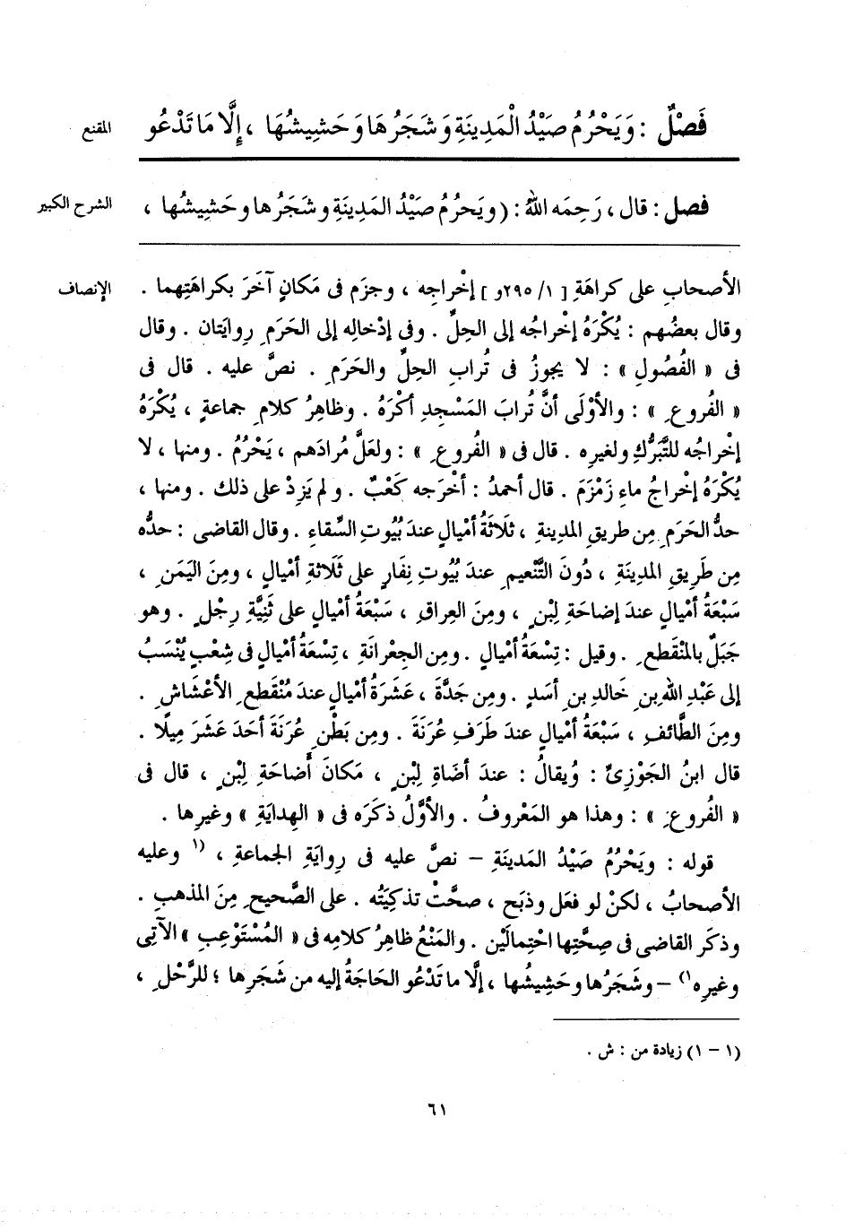 قوله: ويَحْرُمُ صَيْدُ المَدينَةِ -نصَّ عليه فى رِوايَةِ الجماعةِ، [وعليه الأصحابُ، لكنْ لو فعَل وذبَح، صحَّت تذكِيَتُه. على الصَّحيحِ مِنَ المذهب. وذكَر القاضى فى صِحَّتِها احْتِمالَيْن. والمَنْعُ ظاهِرُ كلامِه فى «المُسْتَوْعِبِ» الآتِى وغيرِه] (¬1) - وشَجَرُها وحَشِيشُها، إلَّا ما تَدْعُو الحَاجَةُ إليه من شَجَرِها؛ للرَّحْلِ،