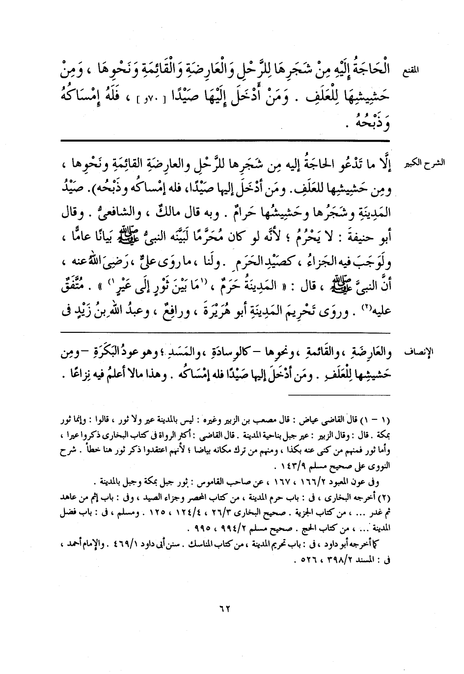 الْحَاجَةُ إِلَيْهِ مِنْ شَجَرِهَا لِلرَّحْلِ وَالْعَارِضَةِ وَالْقَائِمَةِ وَنَحْوِهَا، وَمِنْ حَشِيشِهَا لِلْعَلَفِ. وَمَنْ أَدْخَلَ إِلَيْهَا صَيْدًا, فَلَهُ إِمْسَاكُهُ وَذَبْحُهُ.