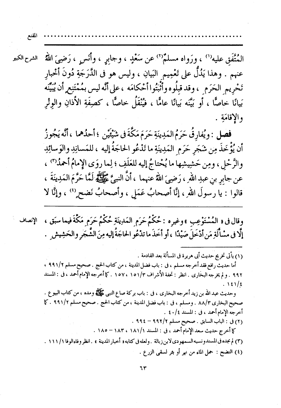 وقال فى «المُسْتَوْعِبِ» وغيرِه: حُكْمُ حَرَمِ المَدِينَةِ حُكْمُ حَرَمِ مَكةَ فيما سبَق، إلَّا فى مسْألةِ مَن أدْخَلَ صَيْدًا، أو أخَذَ ما تدْعُو الحاجَةُ إليه مِنَ الشَّجَرِ والحَشِيشِ.