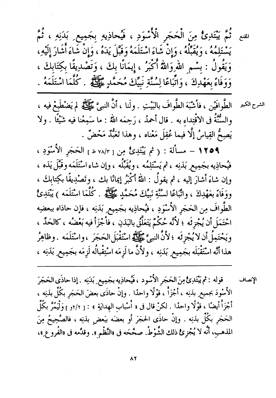 قوله: ثم يَبْتَدِئُ مِنَ الحَجَرِ الأَسْود، فَيُحاذِيه بجَمِيعِ بَدَنِه. إذا حاذَى الحَجَرَ الأسْودَ بجميعِ بدَنِه، أجْزَأَ، قوْلًا واحدًا. وإنْ حاذَى بعضَ الحَجَرِ بكُلِّ بدَنِه، أجْزَأ أَيضًا، قوْلًا واحدًا. لكنْ قال فى «أسْبابِ الهِدايةِ»: وَلْيَمُرَّ بكُلِّ الحَجَرِ بكُلِّ بدَنِه. وإنْ حاذَى الحجَرَ أو بعضَه ببَعض بدَنِه، فالصَّحِيحُ مِنَ المذهبِ، أنَّه لا يُجْزِئُ ذلك الشَّوْطُ. صحَّحَه فى «النَّظْمِ». وقدَّمه فى «الفُروعِ»،