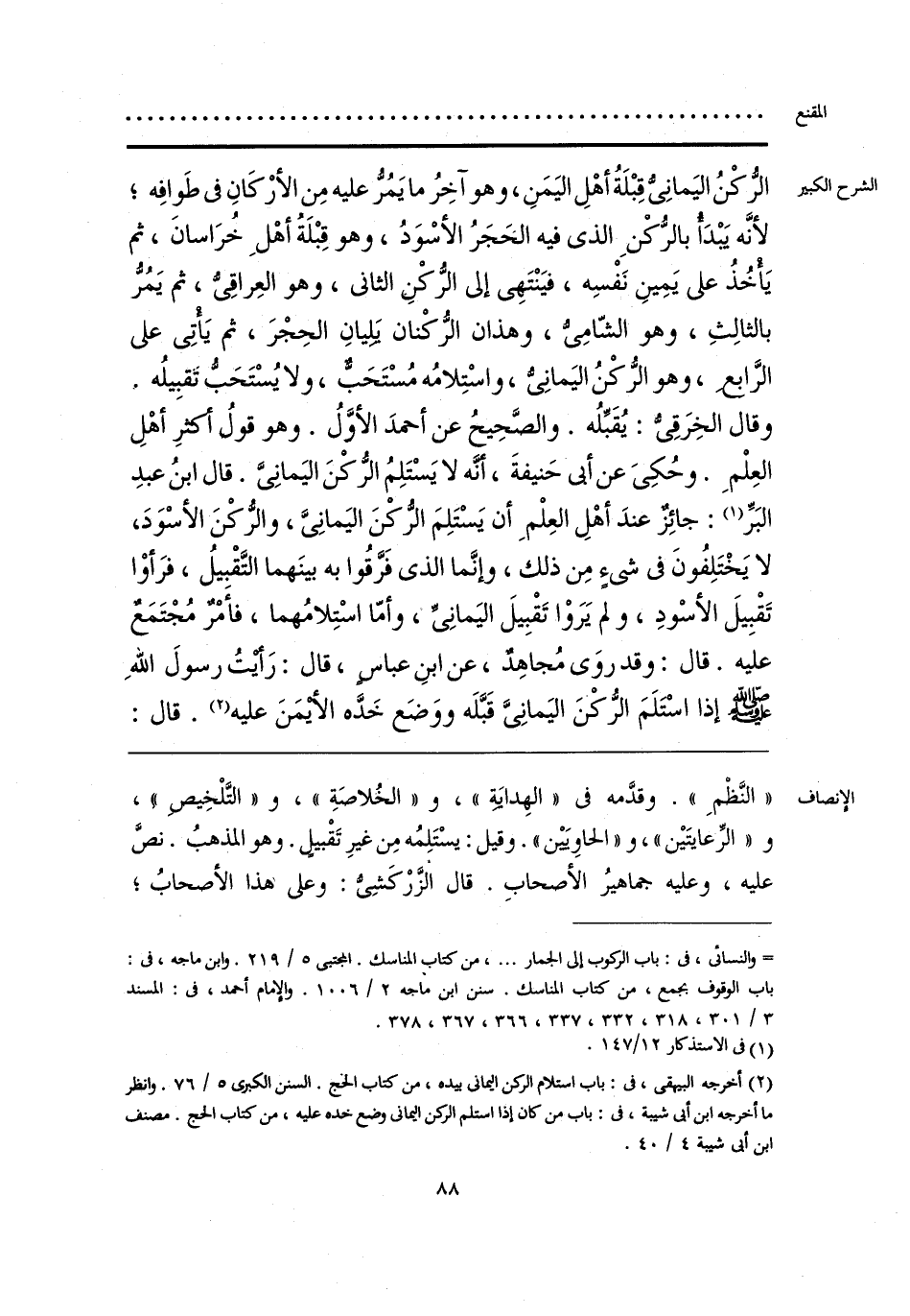 «النَّظْمِ». وقدَّمه فى «الهِدايَةِ»، و «الخُلاصَةِ»، و «التَّلْخِيصِ»، و «الرِّعايتَيْن»، و «الحاوِيَيْن». وقيل: يسْتَلِمُه مِن غيرِ تَقْبيلٍ. وهو المذهبُ. نصَّ عليه، وعليه جماهيرُ الأصحابِ. قال الزَّرْكَشِىُّ: وعلى هذا الأصحابُ؛