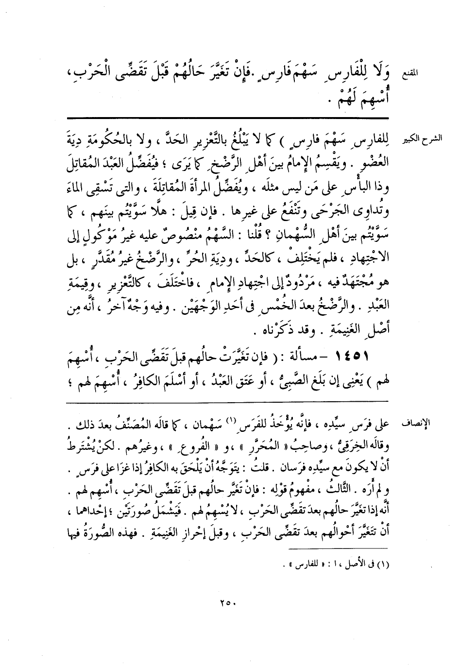 على فرَسِ سيِّدِه، فإنَّه يُؤْخَذُ للفَرَسِ (¬1) سَهْمان، كما قالَه المُصَنِّفُ بعدَ ذلك. وقالَه الخِرَقِىُّ، وصاحِبُ «المُحَرَّرِ»، و «الفُروعِ»، وغيرُهم. لكنْ يُشْتَرطُ أنْ لا يكونَ مع سيِّدِه فرَسان. قلتُ: يتَوَجَّهُ أنْ يَلْحَقَ به الكافِرُ إذا غزَا على فرَسٍ. ولم أَرَه. الثَّالثُ، مفْهومُ قوْلِه: فإنْ تَغَيَّر حالُهم قبلَ تَقَضِّى الحَرْبِ، أُسْهِم لهم. أنَّه إذا تغَيَّرَ حالُهم بعدَ تقَضِّى الحَرْبِ، لا يُسْهِمُ لهم. فَيَشْمَلُ صُورَتَيْن؛ إحْداهما، أنْ تتَغَيَّرَ أحْوالُهم بعدَ تقَضِّى الحَرْبِ، وقبلَ إحْرازِ الغَنِيمَةِ. فهذه الصُّورَةُ فيها