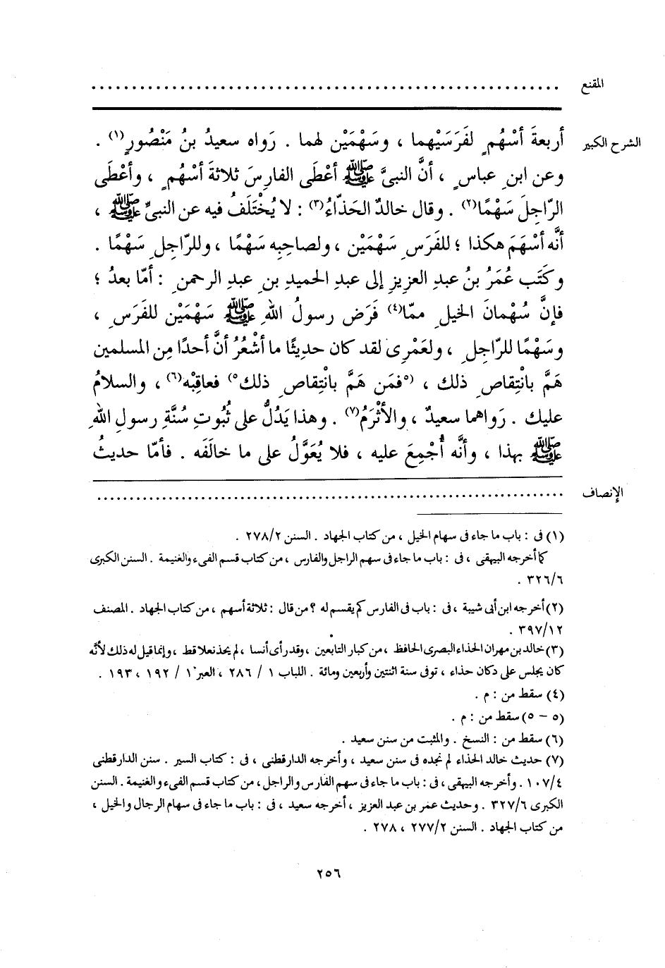 أربعةَ أسْهُمٍ لفَرَسَيْهما، وسَهْمَيْن لهما. رَواه سعيدُ بنُ مَنْصُورٍ (¬1). وعن ابنِ عباسٍ، أنَّ النبىَّ -صلى اللَّه عليه وسلم- أعْطَى الفارِسَ ثلاثةَ أسْهُمٍ، وأعْطَى الرّاجِلَ سَهْمًا (¬2). وقال خالدٌ الحَذّاءُ (¬3): لا يُخْتَلَفُ فيه عن النبىِّ -صلى اللَّه عليه وسلم-، أنَّه أسْهَمَ هكذا؛ للفَرَسِ سَهْمَيْن، ولصاحِبِه سَهْمًا، وللرّاجِلِ سَهْمًا. وكَتَب عُمَرُ بنُ عبدِ العزِيزِ إلى عبدِ الحميدِ بنِ عبدِ الرحمنِ: أمّا بعدُ؛ فإنَّ سُهْمانَ الخيلِ ممّا (¬4) فَرَض رسولُ اللَّهِ -صلى اللَّه عليه وسلم- سَهْمَيْن للفَرَسِ، وسَهْمًا للرّاجِلِ، ولعَمْرِى لقد كان حدِيثًا ما أشْعُرُ أنَّ أحدًا مِن المسلمين هَمَّ بانْتِقاصِ ذلك، [فمَن هَمَّ بانْتِقاصِ ذلك] (¬5) فعاقِبْه (¬6)، والسلامُ عليك. رَواهما سعيدٌ، والأثْرَمُ (¬7). وهذا يَدُلُّ على ثُبُوتِ سُنَّةِ رسولِ اللَّهِ -صلى اللَّه عليه وسلم- بهذا، وأنَّه اجْمِعَ عليه، فلا يُعَوَّلُ على ما خالَفَه. فأمّا حديثُ