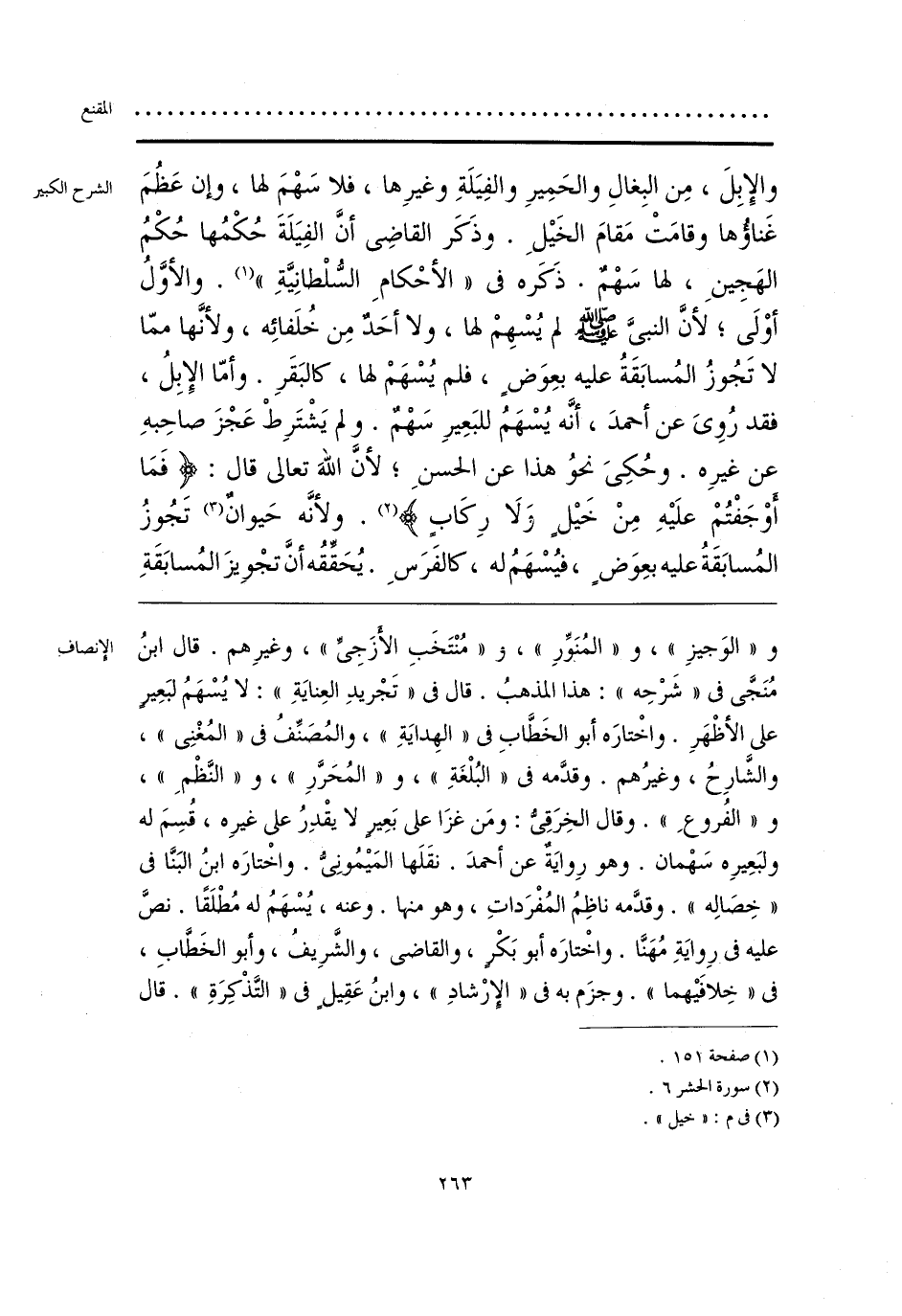 و «الوَجيزِ»، و «المُنوِّرِ»، و «مُنْتَخَبِ الأَزجِىِّ»، وغيرِهم. قال ابنُ مُنَجَّى فى «شَرْحِه»: هذا المذهبُ. قال فى «تَجْريدِ العِنايَةِ»: لا يُسْهَمُ لبَعِيرٍ على الأظْهَرِ. واخْتارَه أبو الخَطَّابِ فى «الهِدايَةِ»، والمُصَنِّفُ فى «المُغْنِى»، والشَّارِحُ، وغيرُهم. وقدَّمه فى «البُلْغَةِ»، و «المُحَرَّرِ»، و «النَّظْمِ»، و «الفُروعِ». وقال الخِرَقِىُّ: ومَن غزَا على بَعِيرٍ لا يقْدِرُ على غيرِه، قسِمَ له ولبَعِيرِه سَهْمان. وهو رِوايَة عن أحمدَ. نقَلَها المَيْمُونِىُّ. واخْتارَه ابنُ البَنَّا فى «خِصَالِه». وقدَّمه ناظِمُ المُفْرَداتِ، وهو منها. وعنه، يُسْهَمُ له مُطْلَقًا. نصَّ عليه فى رِوايَةِ مُهَنَّا. واخْتارَه أبو بَكْرٍ، والقاضى، والشَّرِيفُ، وأبو الخَطَّابِ، فى «خِلافَيْهما». وجزَم به فى «الإِرْشادِ»، وابنُ عَقِيل فى «التَّذْكِرَةِ». قال