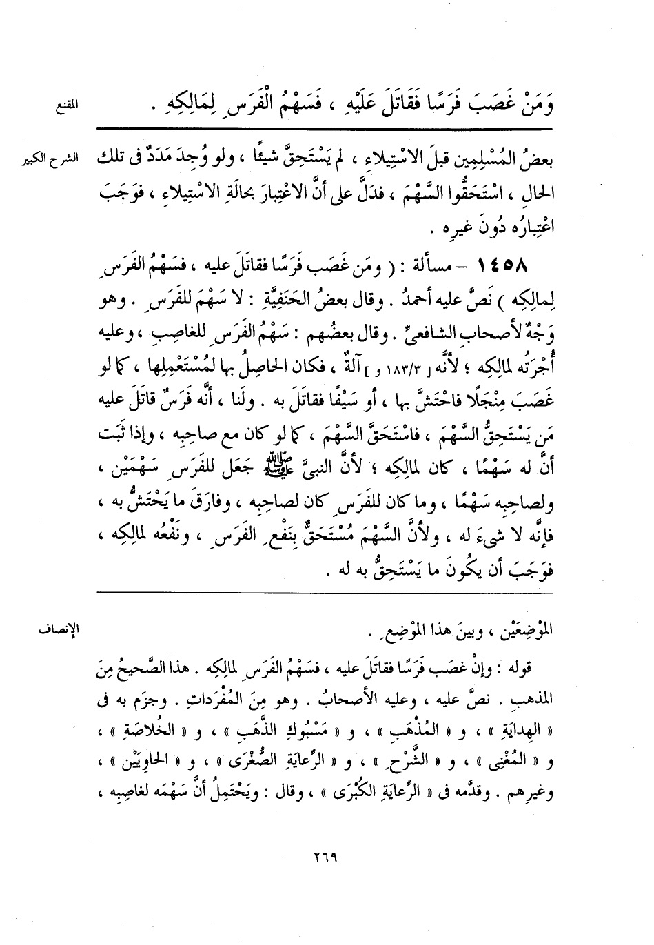 قوله: وإنْ غصَب فَرَسًا فقاتَلَ عليه، فسَهْمُ الفَرَسِ لمالِكِه. هذا الصَّحيحُ مِنَ المذهبِ. نصَّ عليه، وعليه الأصحابُ. وهو مِنَ المُفْرَداتِ. وجزَم به فى «الهِدايَةِ»، و «المُذْهَبِ»، و «مَسْبُوكِ الذَّهَبِ»، و «الخُلاصَةِ»، و «المُغْنِى»، و «الشَّرْحِ»، و «الرِّعايَةِ الصُّغْرَى»، و «الحاوِيَيْن»، وغيرِهم. وقدَّمه فى «الرِّعايَةِ الكُبْرَى»، وقال: ويَحْتَمِلُ أنَّ سَهْمَه لغاصِبِه،