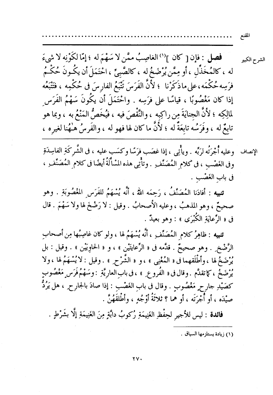 تنبيه: أفادَنا المُصَنِّفُ، رَحِمَه اللَّهُ، أنَّه يُسْهَمُ للفَرَسِ المغْصُوبَةِ. وهو صحيحٌ، وهو المذهبُ، وعليه الأصحابُ. وقيل: لا رَضْخَ لها ولا سَهْمَ. قال فى «الرِّعايَةِ الكُبْرَى»: وهو بعيدٌ.