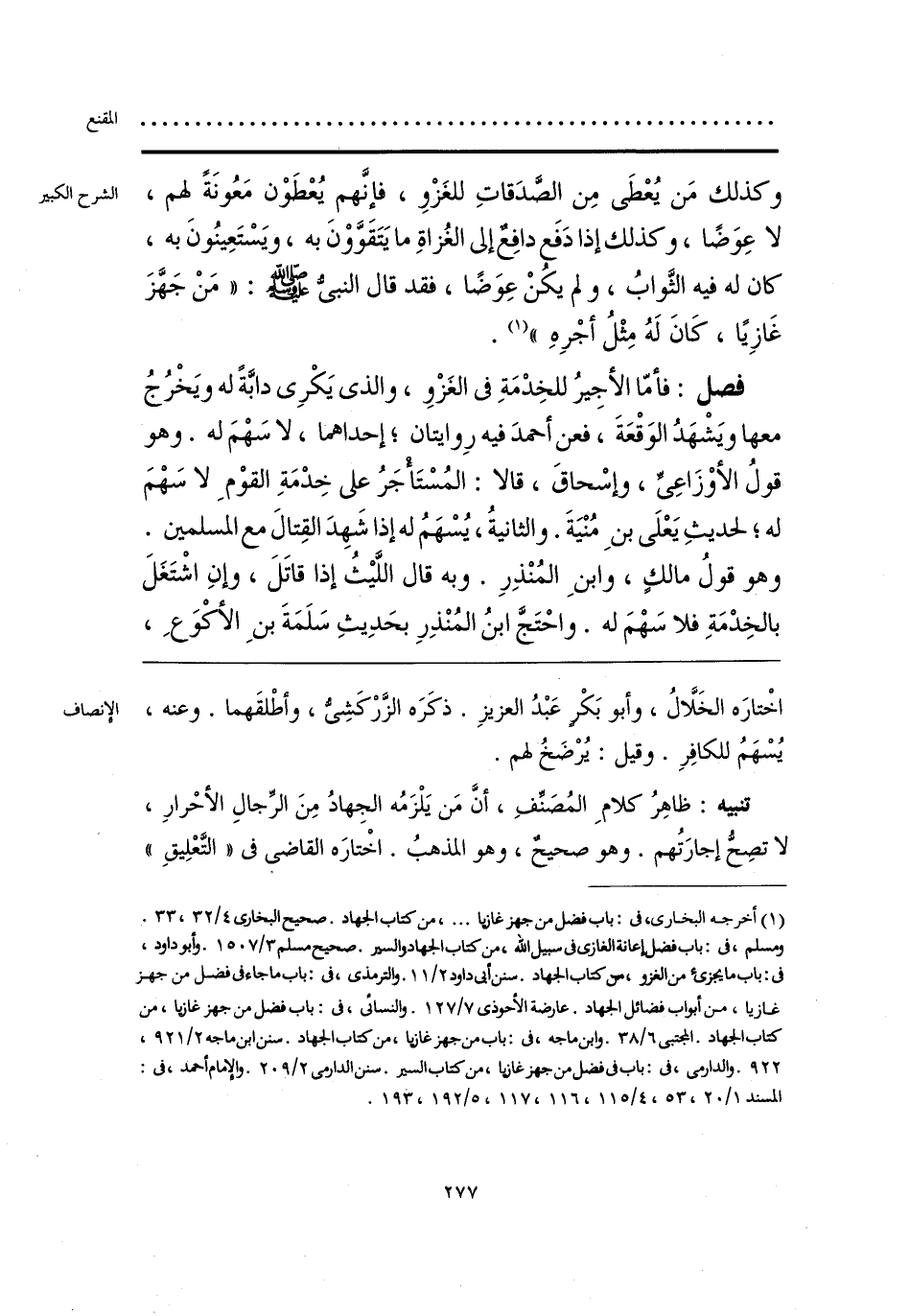 اخْتارَه الخَلَّالُ، وأبو بَكْرٍ عَبْدُ العزيزِ. ذكَرَه الزَّرْكَشِىُّ، وأطْلقَهما. وعنه، يُسْهَمُ للكافِرِ. وقيل: يُرْضَخُ لهم.