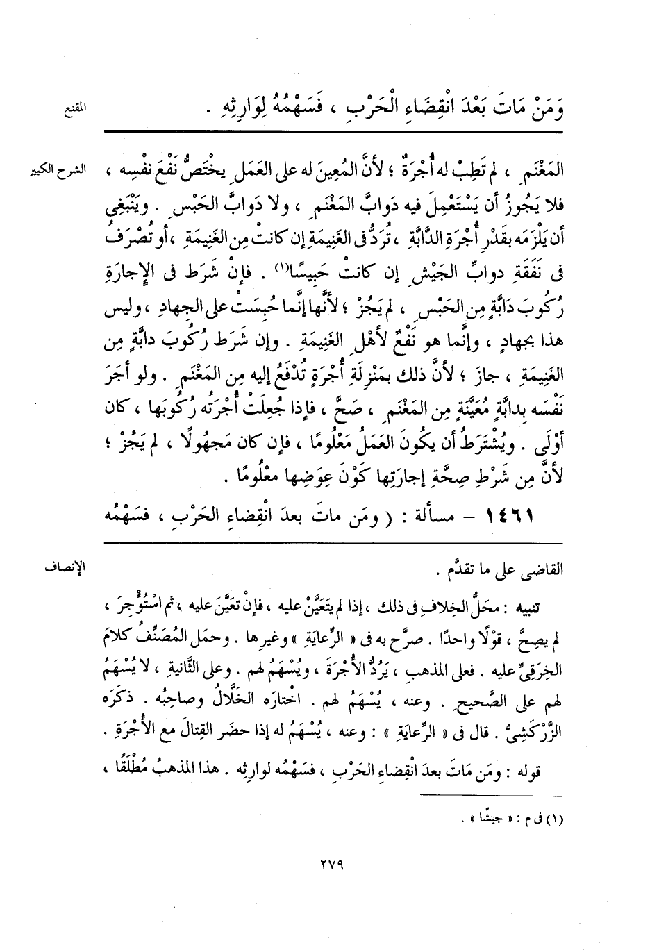 قوله: ومَن مَاتَ بعدَ انْقِضاءِ الحَرْبِ، فسَهْمُه لوارِثِه. هذا المذهبُ مُطْلَقًا،
