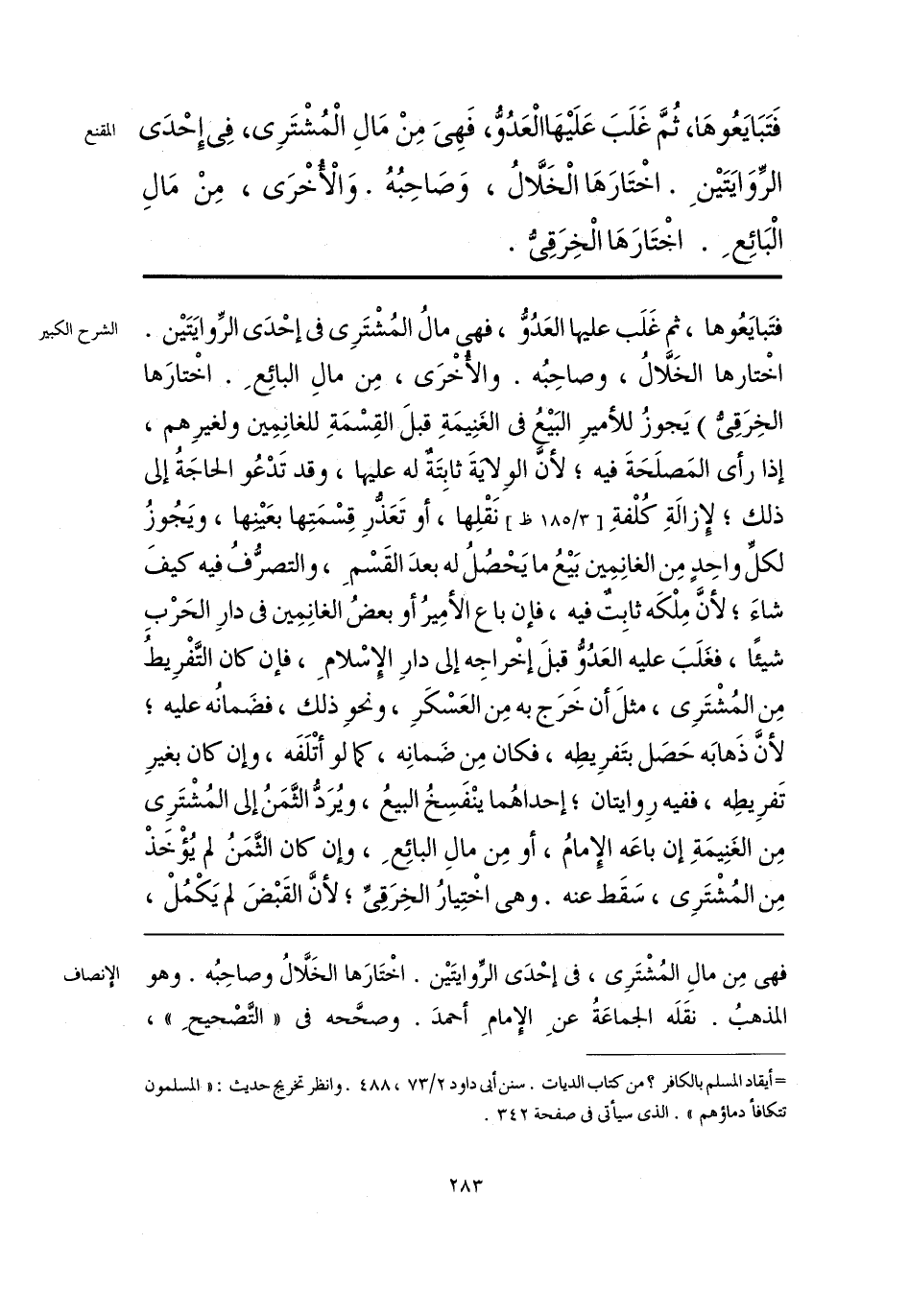 فَتَبَايَعُوهَا، ثُمَّ غَلَبَ عَلَيْهَا الْعَدُوُّ، فَهِىَ مِنْ مَالِ الْمُشْتَرِى، فِى إِحْدَى الرِّوَايَتَيْن. اخْتَارَهَا الْخَلَّالُ، وَصَاحِبُهُ. وَالْأُخْرَى، مِنْ مَالِ الْبَائِعَ. اخْتَارَهَا الْخِرَقِىُّ