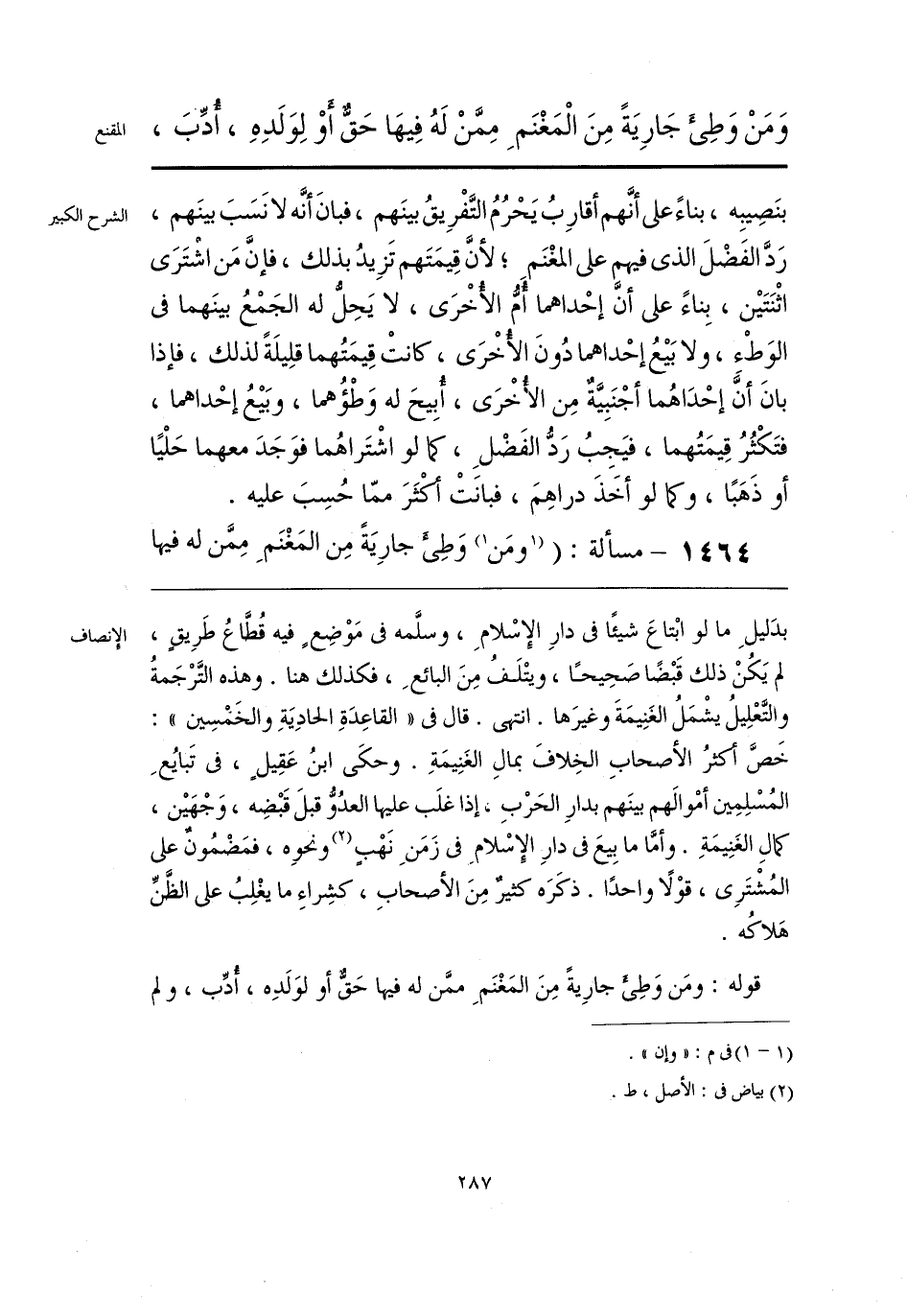 وَمَنْ وَطِئَ جَارِيَةً مِنَ الْمَغْنَمِ مِمَّنْ لَهُ فِيهَا حَقٌّ أَوْ لِوَلَدِهِ، أُدِّبَ،