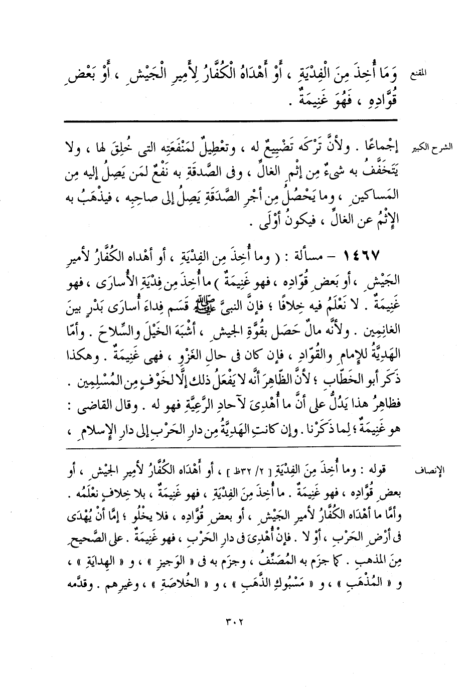 قوله: وما أُخِذَ مِنَ الْفِدْيَةِ، أَوْ أَهْدَاهُ الْكُفَّارُ لِأمِيرِ الْجَيْشِ، أَوْ بَعْضِ قُوَّادِهِ، فَهُوَ غَنِيمَةٌ. ما أُخِذَ مِنَ الفِدْيَةِ، فهو غَنِيمَةٌ، بلا خِلافٍ نعْلَمُه. وأمَّا ما أهْدَاه الكُفَّارُ لأميرِ الجَيْشِ، أو بعضِ قُوَّادِه، فلا يخْلُو؛ إمَّا أنْ يُهْدَى فى أرْضِ الحَرْبِ، أوْ لا. فإنْ أُهْدِىَ فى دارِ الحَرْبِ، فهو غَنِيمَةٌ. على الصَّحيحِ مِنَ المذهبِ. كما جزَم به المُصَنِّفُ، وجزَم به فى «الوَجيزِ»، و «الهِدايَةِ»، و «المُذْهَبِ»، و «مَسْبُوكِ الذَّهَبِ»، و «الخُلاصَةِ»، وغيرِهم. وقدَّمه
