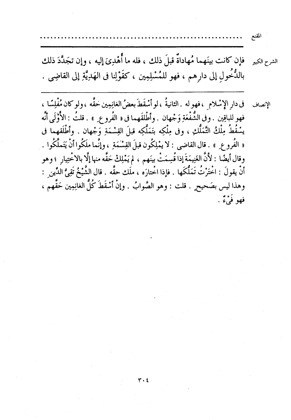 فى دارِ الإِسْلامِ، فهو له. الثَّانيةُ، لو أسْقَطَ بعضُ الغانِمِين حقَّه، ولو كان مُفْلِسًا، فهو للباقِين. وفى الشُّفْعَةِ وَجْهان. وأطْلقَهما فى «الفُروعِ». قلتُ: الأَوْلَى أنَّه يسْقُطُ مِلْكُ التَّمَلُّكِ، وفى مِلْكِه بتَمَلُّكِه قبلَ القِسْمَةِ وَجْهان. وأطْلَقهما فى «الفُروعِ». قال القاضى: لا يمْلِكُون قبلَ القِسمَةِ، وإنَّما ملَكُوا أنْ يَتَملَّكُوا. وقال أيضًا: لأنَّ الغَنِيمَةَ إذا قُسِمَتْ بينَهم، لم يَمْلِكْ حَقَّه منها إلَّا بالاخْتِيارِ؛ وهو أنْ يقولَ: اخْتَرْتُ تَمَلُّكَها. فإذا اخْتارَه، ملَك حقَّه. قال الشَّيْخُ تَقِىُّ الدِّينِ: وهذا ليس بصَحيحٍ. قلت: وهو الصَّوابُ. وإنْ أسْقَطَ كُلُّ الغانِمِين حَقَّهم، فهو فَىْءٌ.