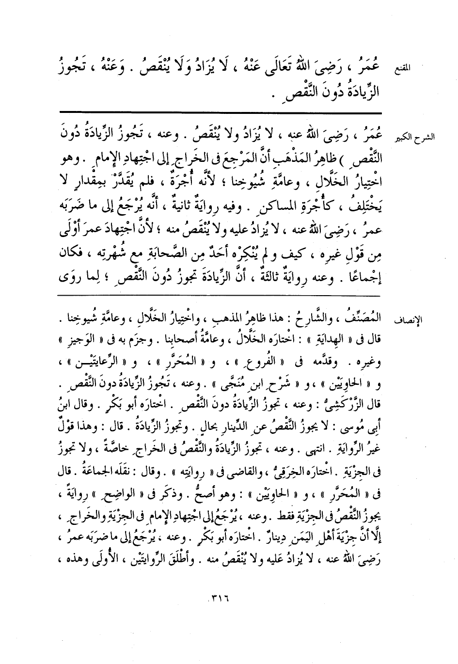 المُصَنِّفُ، والشَّارِحُ: هذا ظاهِرُ المذهبِ، واخْتِيارُ الخَلَّالِ، وعامَّةِ شُيوخِنا. قال فى «الهِدايَةِ»: اخْتارَه الخَلَّالُ، وعامَّةُ أصحابِنا. وجزَم به فى «الوَجيزِ» وغيرِه. وقدَّمه فى «الفُروعِ»، و «المُحَرَّرِ»، و «الرِّعايتَيْن»، و «الحاوِيَيْن»، و «شَرْحِ ابنِ مُنَجَّى». وعنه، تَجُوزُ الزِّيادَةُ دونَ النَّقْصِ. قال الزَّرْكَشِىُّ: وعنه، تجوزُ الزِّيادَةُ دونَ النَّقْصِ. اخْتارَه أبو بَكْرٍ. وقال ابنُ أبِى مُوسى: لا يجوزُ النَّقْصُ عنِ الدِّينارِ بحالٍ. وتجوزُ الزِّيادَةُ. قال: وهذا قوْلٌ غيرُ الرِّوايَةِ. انتهى. وعنه، تجوزُ الزِّيادَةُ والنَّقْصُ فى الخَراجِ خاصَّةً، ولا تجوزُ فى الجِزْيَةِ. اخْتارَه الخِرَقِىُّ، والقاضى فى «رِوايِتِه». وقال: نقَلَه الجماعَةُ. قال فى «المُحَرَّرِ»، و «الحاوِيَيْن»: وهو أصحُّ. وذكَر فى «الواضِحِ» رِوايَةً، يجوزُ النَّقْصُ فى الجِزْيَةِ فقط. وعنه، يُرْجَعُ إلى اجْتِهادِ الإِمامِ فى الجِزْيَةِ والخَراجِ، إلَّا أنَّ جِزْيَةَ أهْلِ اليَمَنِ دِينارٌ. اخْتارَه أبو بَكْرٍ. وعنه: يُرْجَعُ إلى ما ضرَبَه عمرُ، رَضِىَ اللَّهُ عنه، لا يُزادُ عَليه ولا يُنْقَصُ منه. وأطْلَقَ الرِّوايتَيْن، الأُولَى وهذه،