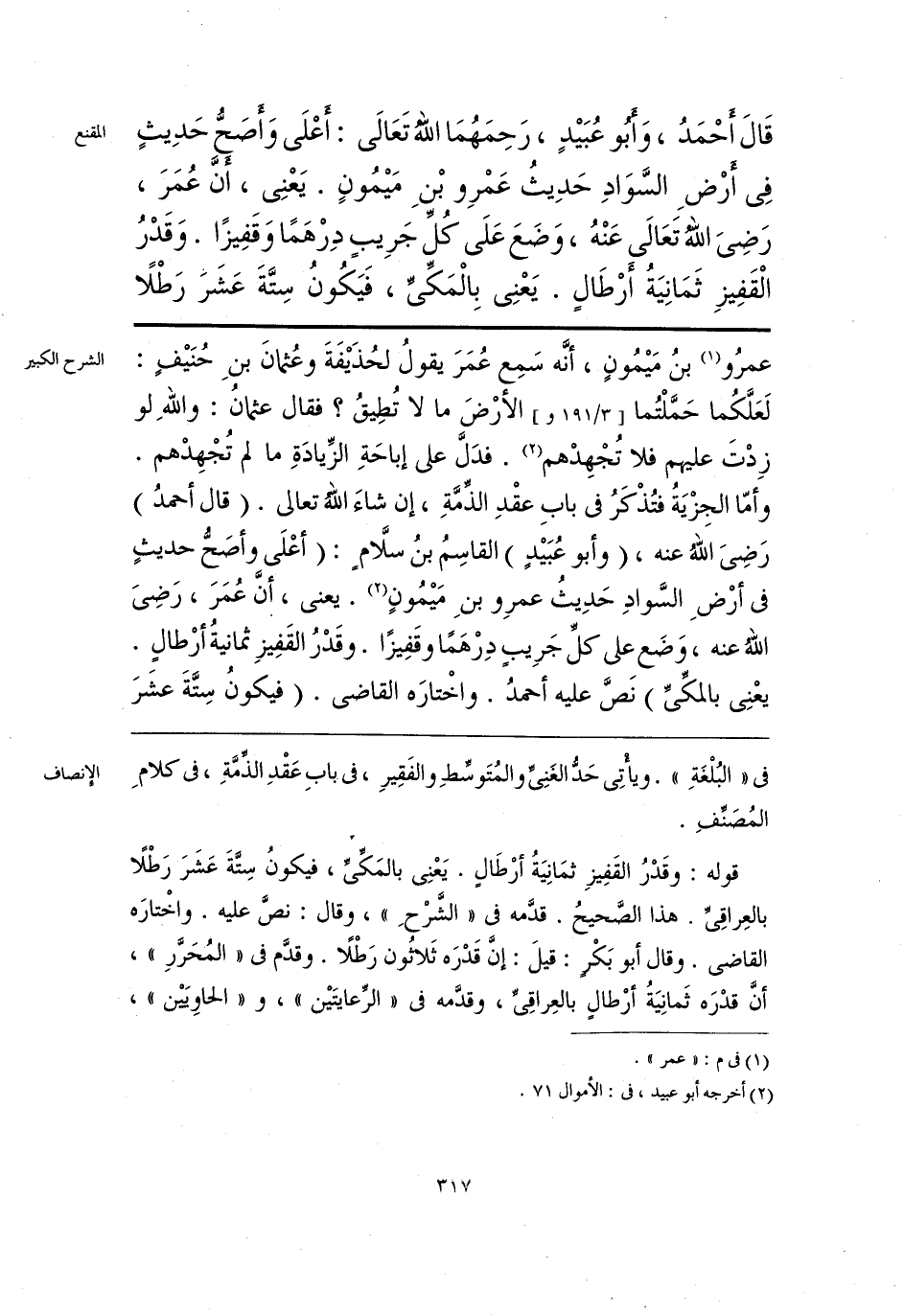 قَالَ أحْمَدُ، وَأَبُو عُبَيْدٍ، رَحِمَهُمَا اللَّه تَعَالَى: أَعْلَى وَأَصَحُّ حَدِيثٍ فِي أَرْضِ السَّوَادِ حَدِيثُ عَمْرِو بْنِ مَيْمُونٍ. يَعْنِى، أَنَّ عُمَرَ، رَضِىَ اللَّهُ تَعَالَى عَنْهُ، وَضَعَ عَلَى كُلِّ جَرِيبٍ دِرْهَمًا وَقَفِيزًا. وَقَدْرُ الْقَفِيزِ ثَمَانِيَةُ أَرْطَالٍ. يَعْنِى بِالْمَكِّىِّ، فَيَكُونُ سِتَّةَ عَشَرَ رَطْلًا