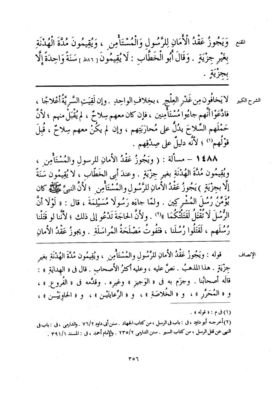 وَيَجُوزُ عَقْدُ الأَمَانِ لِلرَّسُولِ وَالْمُسْتَأْمِنِ، وَيُقِيمُونَ مُدَّةَ الْهُدْنَةِ بِغَيْرِ جِزْيَةٍ. وَقَالَ أبو الْخَطَّابِ: لَا يُقِيمُونَ سَنَةً وَاحِدَةً إِلَّا بِجِزْيَةٍ.