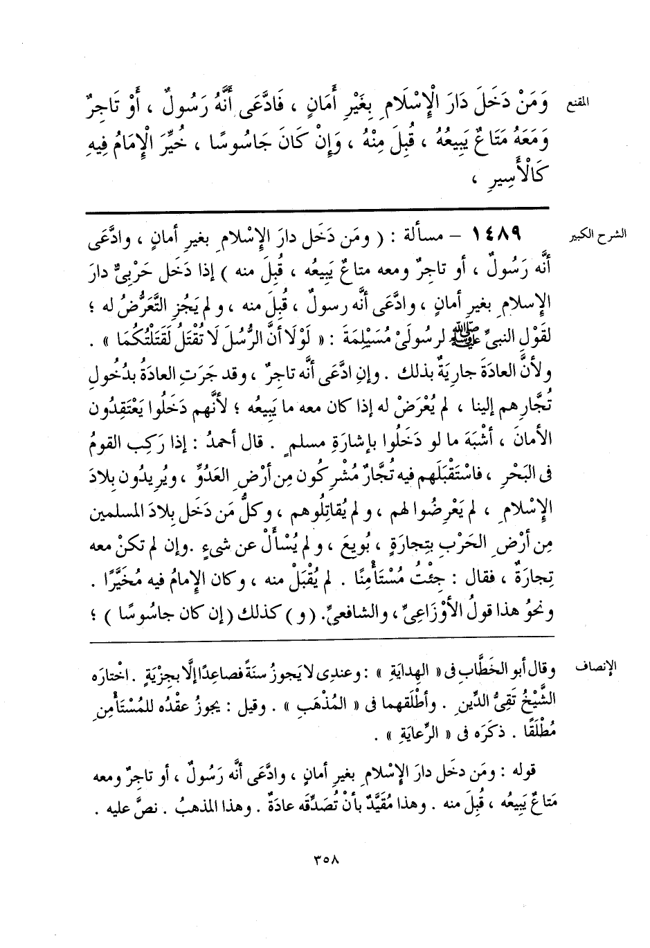 وَمَنْ دَخَلَ دَارَ الإِسْلَام بِغَيْرِ أَمَانٍ، فَادَّعَى أَنَّهُ رَسُولٌ، أَوْ تَاجِرٌ وَمَعَهُ مَتَاعٌ يَبِيعُهُ، قُبِلَ مِنْهُ، وَإنْ كَانَ جَاسُوسًا، خُيِّرَ الإِمَامُ فِيهِ كَالْأَسِيرِ،