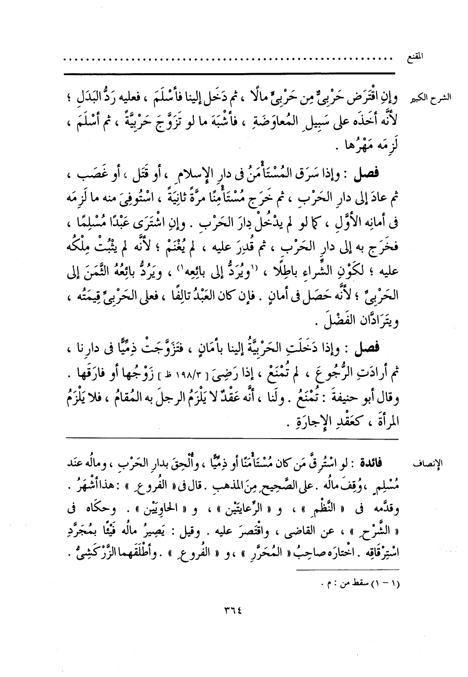 فائدة: لو اسْتُرِقَّ مَن كان مُسْتَأْمَنًا أو ذِمِّيًّا، وأُلْحِقَ بدارِ الحَرْبِ، ومالُه عنَد مُسْلِمٍ، وُقِفَ مالُه. على الصَّحِيحِ مِنَ المذهبِ. قال فى «الفُروعِ»: هذا أشْهَرُ. وقدَّمه فى «النَّظْمِ»، و «الرِّعايتَيْن»، و «الحاوِيَيْن». وحكَاه فى «الشَّرْحِ»، عن القاضى، واقْتَصرَ عليه. وقيل: يَصِيرُ مالُه فَيْئًا بمُجَرَّدِ اسْتِرْقَاقِه. اخْتارَه صاحِبُ «المُحَرَّرِ»، و «الفُروعِ». وأطْلَقَهما الزَّرْكَشِىُّ.
