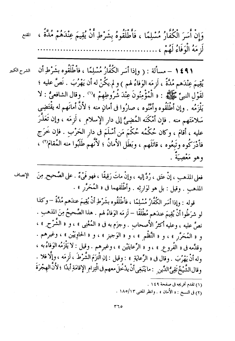 قوله: وإذا أسَر الكُفَّارُ مُسْلِمًا، فأطْلَقُوه بشَرْطِ أنْ يُقِيمَ عندَهم مُدَّةً -وكذا لو شرَطُوا أنْ يُقِيمَ عندَهم مُطْلَقًا- لَزِمَه الوَفاءُ لهم. هذا الصَّحيحُ مِنَ المذهبِ. نصَّ عليه، وعليه أكثرُ الأصحابِ. وجزَم به فى «المُغْنِى»، و «الشَّرْحِ»، و «المُحَرَّرِ»، و «النَّظْمِ»، و «الوَجيزِ»، و «الحاوِيَيْن»، وغيرِهم. وقدَّمه فى «الفُروعِ»، و «الرِّعايتَيْن»، وغيرِهم. وقيل: لا يَلْزَمُه الوَفاءُ به، وله أنْ يَهْرُبَ. وقال فى «الرِّعايَةِ»: وقيل: إنِ الْتزَمَ الشَّرْطَ، لَزِمَه، وإلَّا فلا. وقال الشَّيْخُ تَقِىُّ الدِّينِ: ما يَنْبَغِى أنْ يدْخُلَ معهم فى الْتِزامِ الإِقامَةِ أبدًا؛ لأنَّ الهِجْرَةَ