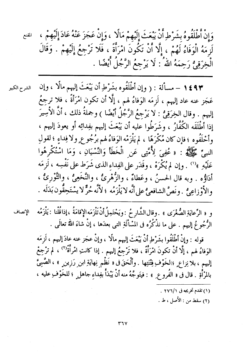 وَإِنْ أَطْلَقُوهُ بِشَرْطِ أَنْ يَبْعَثَ إِلَيْهِمْ مَالًا، وَإِنْ عَجَزَ عَنْهُ عَادَ إِلَيْهِمْ، لَزِمَهُ الْوَفَاءُ لَهُمْ، إِلَّا أَنْ تَكُونَ امْرَأَةً، فَلَا تَرْجِعُ إِلَيْهِمْ. وَقَالَ الْخِرَقِىُّ رَحِمَهُ اللَّهُ: لَا يَرْجِعُ الرَّجُلُ أَيْضًا.