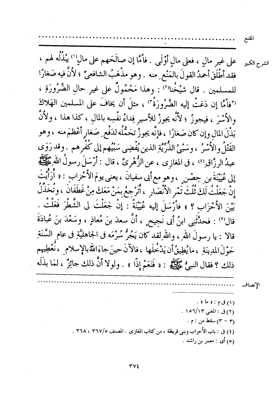 على غيرِ مالٍ، فعلى مالٍ أوْلَى. فأمَّا إن صالَحَهم على مالٍ (¬1) يبْذُلُه لهم، فقد أطْلَقَ أحمدُ القولَ بالمَنْعِ منه. وهو مذْهَبُ الشافعىِّ؛ لأنَّ فيه صَغارًا للمسلمين. قال شيْخُنا (¬2): وهذا مَحْمُولٌ على غيرِ حالِ الضَّرُورَةِ، [فأمَّا إن دَعَتْ إليه الضَّرُورَةُ] (¬3)، مثلَ أن يخافَ على المسلمين الهَلاكَ والأسْرَ، فيجوزُ؛ لأنَّه يجوزُ للأسيرِ فِداءُ نفْسِه بالمالِ، كذا هذا، ولأنَّ بَذْلَ المالِ وإن كان صَغارًا، فإنَّه يجوزُ تحَمُّلُه لدَفْعِ صَغارٍ أعْظمَ منه، وهو القَتْلُ والأسْرُ، وسَبْىُ الذُّرِّيَّةِ الذين يُفْضِى سَبْيُهم إلى كُفْرِهم. وقد رَوَى عبدُ الرزَّاقِ (¬4)، في المغازِى، عن الزُّهْرِىِّ، قال: أرْسَلَ رسولُ اللَّهِ -صلى اللَّه عليه وسلم- إلى عُيَيْنَةَ بنِ حِصْنٍ، وهو مع أبى سفيانَ، يعنى يومَ الأحْزابِ: «أَرَأَيْتَ إِنْ جَعَلْتُ لَكَ ثُلُثَ تَمْرِ الأنْصَارِ، أَتَرْجِعُ بِمَنْ مَعَكَ مِنْ غَطَفَانَ، وتُخَذِّلُ بَيْنَ الأحْزَابِ؟» فأرْسَلَ إليه عُيَيْنَةُ: إنْ جَعَلْتَ لى الشَّطْرَ فَعَلْتُ. قال (¬5): فحدَّثَنِي ابنُ أبى نَجِيحٍ، أنَّ سعدَ بنَ مُعاذٍ، وسَعْدَ بنَ عُبادَةَ قالا: يا رسولَ اللَّهِ، واللَّهِ لقد كان يَجُرُّ سُرْمَه في الجاهليَّةِ في عامِ السَّنَةِ حَوْلَ المدِينَةِ، ما يُطِيقُ أن يَدْخُلَها، فالآنَ حينَ جاءَ اللَّهُ بالإِسلامِ، نُعْطِيهم ذلك؟ فقال النبىُّ -صلى اللَّه عليه وسلم-: «فَنَعَمْ إِذًا». ولولا أنَّ ذلك جائِزٌ، لمَا بذَلَه