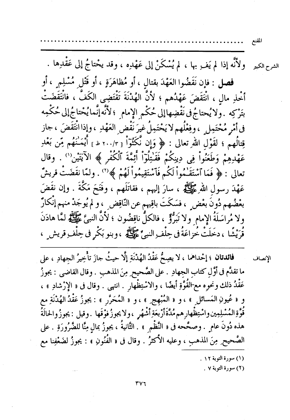 فائدتان؛ إحْداهما، لا يصِحُّ عَقْدُ الهُدْنَةِ إلَّا حيثُ جازَ تأْخِيرُ الجِهادِ، على ما تقدَّم فى أوَّلِ كتابِ الجِهادِ. على الصَّحيحِ مِنَ المذهبِ. وقال القاضى: يجوزُ عَقْدُ ذلك ونحوِه مع القُوَّةِ أيضًا، والاسْتِظْهارِ. انتهى. وقال فى «الإِرْشادِ»، و «عُيونِ المَسائلِ»، و «المُبْهِجِ»، و «المُحَرَّرِ»: يجوزُ عَقْدُ الهُدْنَةِ مع قُوَّةِ المُسْلِمِين واسْتِظْهارِهم مُدَّةَ أرْبعَةِ أشْهُرٍ، ولا يجوزُ فوْقَها. وقيل: يجوزُ والحالَةُ هذه دُونَ عامٍ. وصحَّحه فى «النَّظْمِ». الثَّانيةُ، يجوزُ بمالٍ مِنَّا للضَّرُورَةِ. على الصَّحيحِ مِنَ المذهبِ، وعليه الأكثرُ. وقال فى «الفُنُونِ»: يجوزُ لضَعْفِنا مع