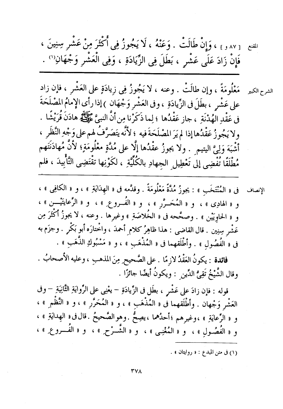 فى «المُنْتَخَبِ»: يجوزُ مُدَّةً مَعْلُومَةً. وقدَّمه فى «الهِدَايَةِ»، و «الكافِى»، و «الهادِى»، و «المُحَرَّرِ»، و «الفُروعِ»، و «الرِّعايتَيْن»، و «الحاوِيَيْن». وصحَّحه فى «الخُلاصَةِ» وغيرِها. وعنه، لا يجوزُ أكْثَرَ مِن عَشْرِ سِنِين. قال القاضى: هذا ظاهِرُ كلامِ أحمدَ، واخْتارَه أبو بَكْرٍ. وجزَم به فى «الفُصُولِ». وأطْلَقهما فى «المُذْهَبِ»، و «مَسْبُوكِ الذَّهَبِ».