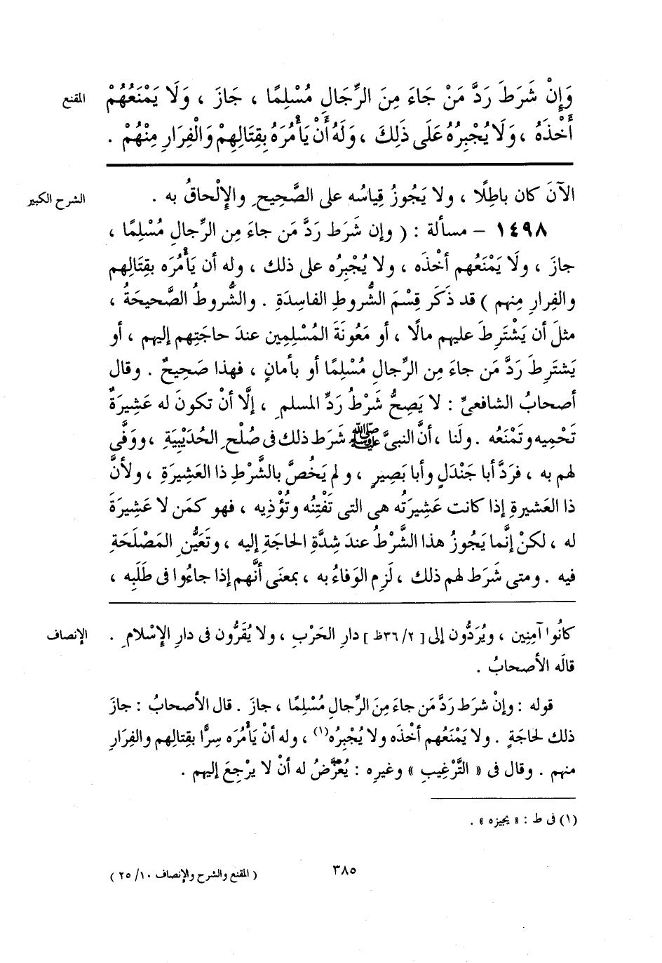قوله: وإنْ شرَط رَدَّ مَن جاءَ مِنَ الرِّجالِ مُسْلِمًا، جازَ. قال الأصحابُ: جازَ ذلك لحاجَةٍ. ولا يَمْنَعُهم أخْذَه ولا يُجْبِرُه (¬1)، وله أنْ يَأْمُرَه سِرًّا بقِتالِهم والفِرَارِ منهم. وقال فى «التَّرْغِيبِ» وغيرِه: يُعرَّضُ له أنْ لا يرْجِعَ إليهم.
