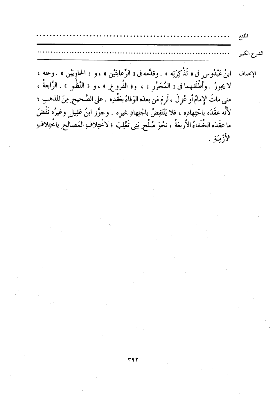 ابنُ عَبْدُوسٍ فى «تَذْكِرَتِه». وقدَّمه فى «الرِّعايتَيْن»، و «الحاوِيَيْن». وعنه، لا يجوزُ. وأطْلَقهما فى «المُحَرَّرِ»، و «الفُروعِ»، و «النَّظْمِ». الرَّابعةُ، متى ماتَ الإِمامُ أو عُزِلَ، لَزِمَ مَن بعدَه الوَفاءُ بعَقْدِه. على الصَّحيحِ مِنَ المذهبِ؛ لأنَّه عقَدَه باجْتِهادِه، فلا يَنْتَقِضُ باجْتِهادِ غيرِه. وجوَّز ابنُ عَقِيلٍ وغيرُه نَقْضَ ما عقَدَه الخُلَفاءُ الأربعَةُ، نحْوَ صُلْحِ بَنِى تَغْلِبَ؛ لاخْتِلافِ المَصالحِ باخْتِلافِ الأزْمِنَةِ.