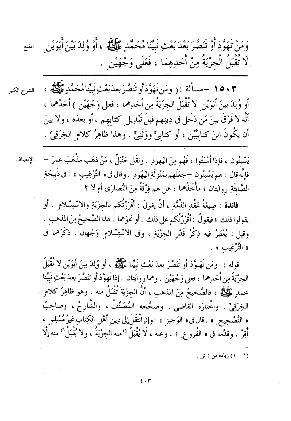 قوله: ومَن تَهَوَّدَ أو تَنَصَّرَ بعدَ بَعْثِ نَبِيِّنا -صلى اللَّه عليه وسلم-، أو وُلِدَ بينَ أبَوَيْن لا تُقْبَلُ الجِزْيَةُ مِن أَحَدِهما، فعلى وَجْهَيْن. وهما رِوايَتان. إذا تَهوَّدَ أو تنَصَّرَ بعدَ بَعْثِ نَبِيِّنا محمدٍ -صلى اللَّه عليه وسلم-، فالصَّحيحُ مِنَ المذهبِ، أنَّ الجِزْيَةَ تُقْبَلُ منه. وهو ظاهِرُ كلامِ الخِرَقِىِّ. واخْتارَه القاضى. وصحَّحه المُصَنِّفُ، والشَّارِحُ، وصاحِبُ «التَّصْحِيحِ». قال فى «الوَجيزِ»: وإنِ انْتقَلَ إلى دِينِ أهْلِ الكِتابِ غيرُ مُسْلِمٍ، أُقِرَّ. وقدَّمه فى «الفُروعِ». وعنه، لا يُقْبَلُ [منه الجِزْيَةُ، ولا يُقْبَلُ] (¬1) منه إلَّا