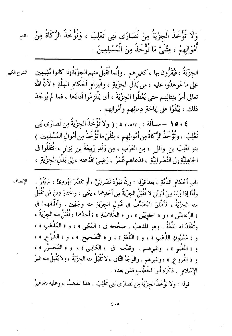 وَلَا تُؤْخَذُ الْجِزْيَةُ مِنْ نَصَارَى بَنِى تَغْلِبَ، وَتُؤْخَذُ الزَّكَاةُ مِنْ أَمْوَالِهِمْ، مِثْلَىْ مَا تُؤْخَذُ مِنَ الْمُسْلِمِينَ.