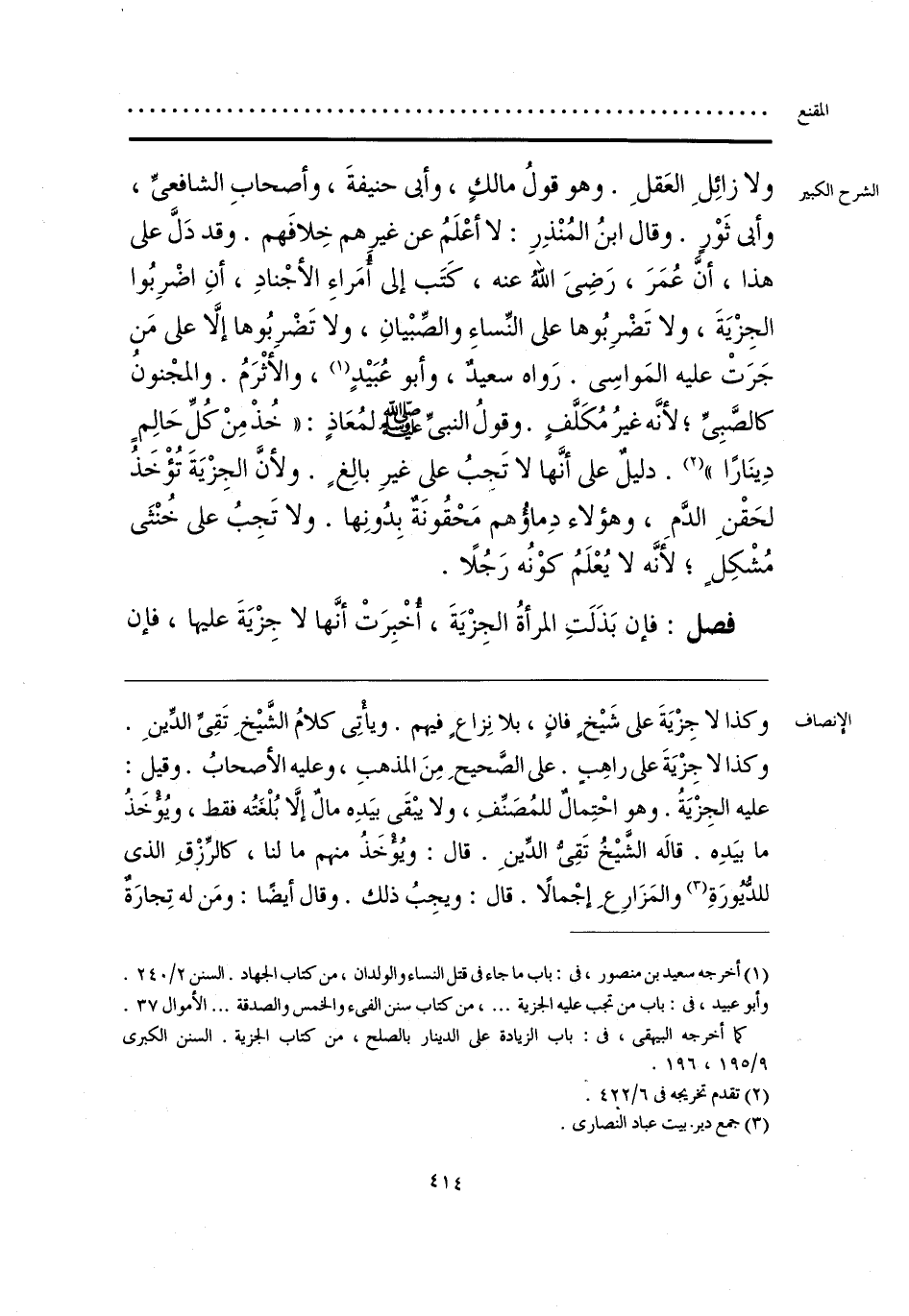وكذا لا جِزْيَةَ على شَيْخٍ فانٍ، بلا نِزاعٍ فيهم. ويأْتِى كلامُ الشَّيْخِ تَقِىِّ الدِّينِ. وكذا لا جِزْيَةَ على راهِبٍ. على الصَّحيحِ مِنَ المذهبِ، وعليه الأصحابُ. وقيل: عليه الجِزْيَةُ. وهو احْتِمالٌ للمُصَنِّفِ، ولا يبْقَى بيَدِه مالٌ إلَّا بُلْغَتُه فقط، ويُؤْخَذُ ما بيَدِه. قالَه الشَّيْخُ تَقِىُّ الدِّينِ. قال: ويُؤْخَذُ منهم ما لنا، كالرِّزْقِ الذى للدُّيُورَةِ (¬1) والمَزَارِعِ إجْمالًا. قال: ويجِبُ ذلك. وقال أيضًا: ومَن له تِجارَةٌ