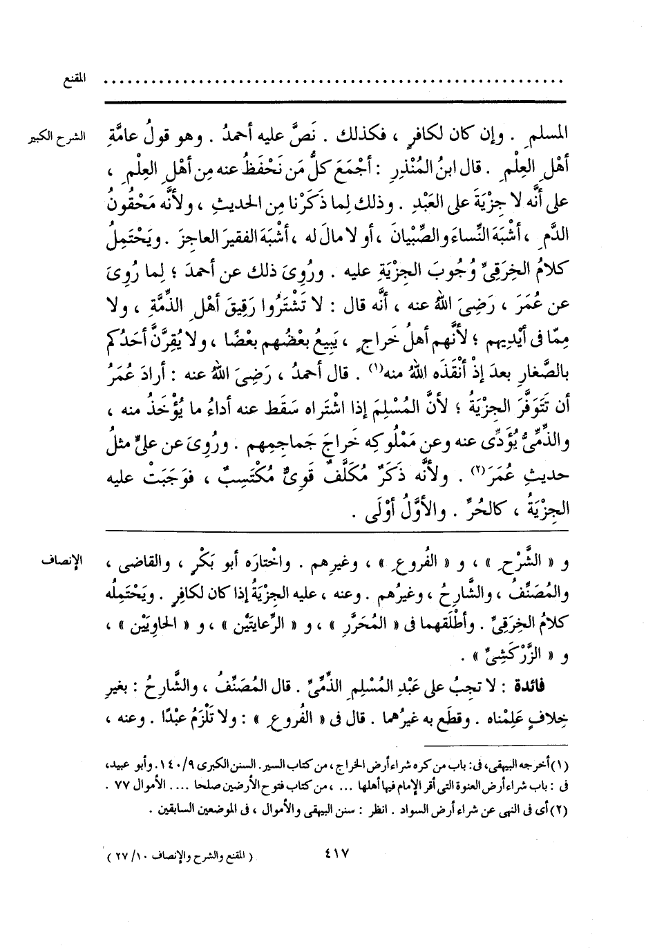 و «الشَّرْحِ»، و «الفُروعِ»، وغيرِهم. واخْتارَه أبو بَكْرٍ، والقاضى، والمُصَنِّفُ، والشَّارِحُ، وغيرُهم. وعنه، عليه الجِزْيَةُ إذا كان لكافِرٍ. ويَحْتَمِلُه كلامُ الخِرَقِىِّ. وأطْلَقهما فى «المُحَرَّرِ»، و «الرِّعايتَيْن»، و «الحاوِيَيْن»، و «الزَّرْكَشِىِّ».