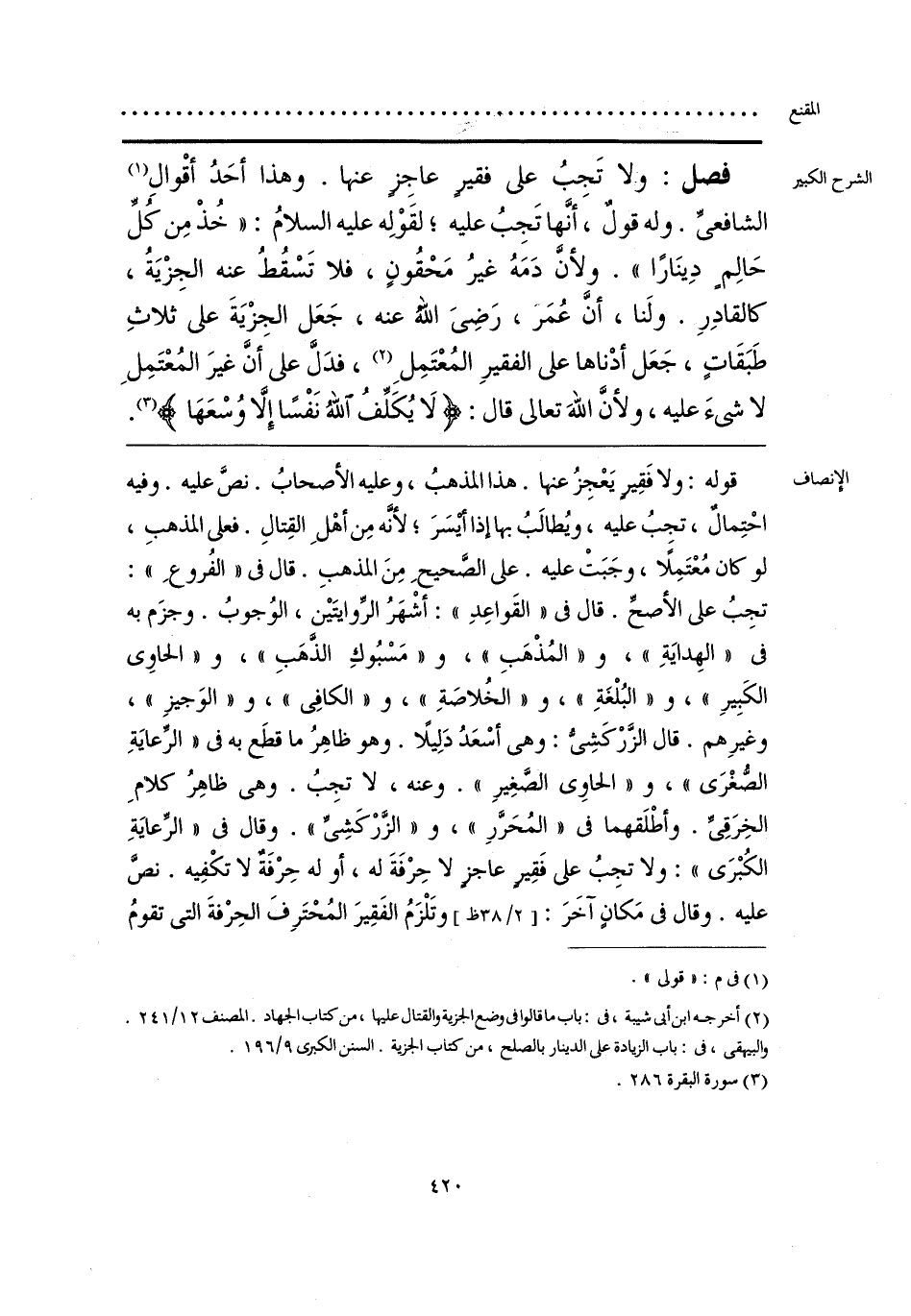 قوله: ولا فَقِيرٍ يَعْجِزُ عنها. هذا المذهبُ، وعليه الأصحابُ. نصَّ عليه. وفيه احْتِمالٌ، تجِبُ عليه، ويُطالَبُ بها إذا أيْسَرَ؛ لأنَّه مِن أهْلِ القِتالِ. فعلى المذهبِ، لو كان مُعْتَمِلًا، وجَبَتْ عليه. على الصَّحيحِ مِنَ المذهبِ. قال فى «الفُروعِ»: تجِبُ على الأصحِّ. قال فى «القَواعِدِ»: أشْهَرُ الرِّوايتَيْن، الوُجوبُ. وجزَم به فى «الهِدايَةِ»، و «المُذْهَبِ»، و «مَسْبُوكِ الذَّهَبِ»، و «الحاوِى الكَبِيرِ»، و «البُلْغَةِ»، و «الخُلاصَةِ»، و «الكافِى»، و «الوَجيزِ»، وغيرِهم. قال الزَّرْكَشِىُّ: وهى أسْعَدُ دَلِيلًا. وهو ظاهِرُ ما قطَع به فى «الرِّعايَةِ الصُّغْرَى»، و «الحاوِى الصَّغِيرِ». وعنه، لا تجِبُ. وهى ظاهِرُ كلامِ الخِرَقِىِّ. وأطْلَقهما فى «المُحَرَّرِ»، و «الزَّرْكَشِىِّ». وقال فى «الرِّعايَةِ الكُبْرَى»: ولا تجِبُ على فَقِيرٍ عاجزٍ لا حِرْفَةَ له، أو له حِرْفَةٌ لا تكْفِيه. نصَّ عليه. وقال فى مَكانٍ آخَرَ: وتَلْزَمُ الفَقِيرَ المُحْتَرِفَ الحِرْفةَ التى تقومُ