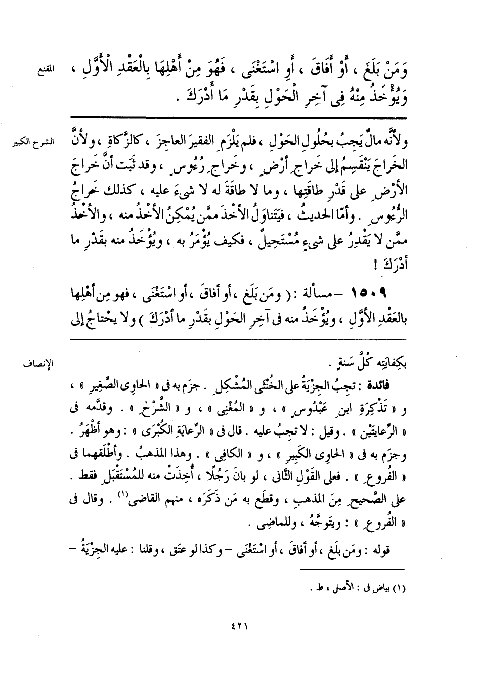 وَمَنْ بَلَغَ، أَوْ أَفَاقَ، أَوِ اسْتَغْنَى، فَهُوَ مِنْ أَهْلِهَا بِالْعَقْدِ الْأَوَّلِ، وَيُؤْخَذُ مِنْهُ فِى آخِرِ الْحَوْلِ بِقَدْرِ مَا أَدْرَكَ.