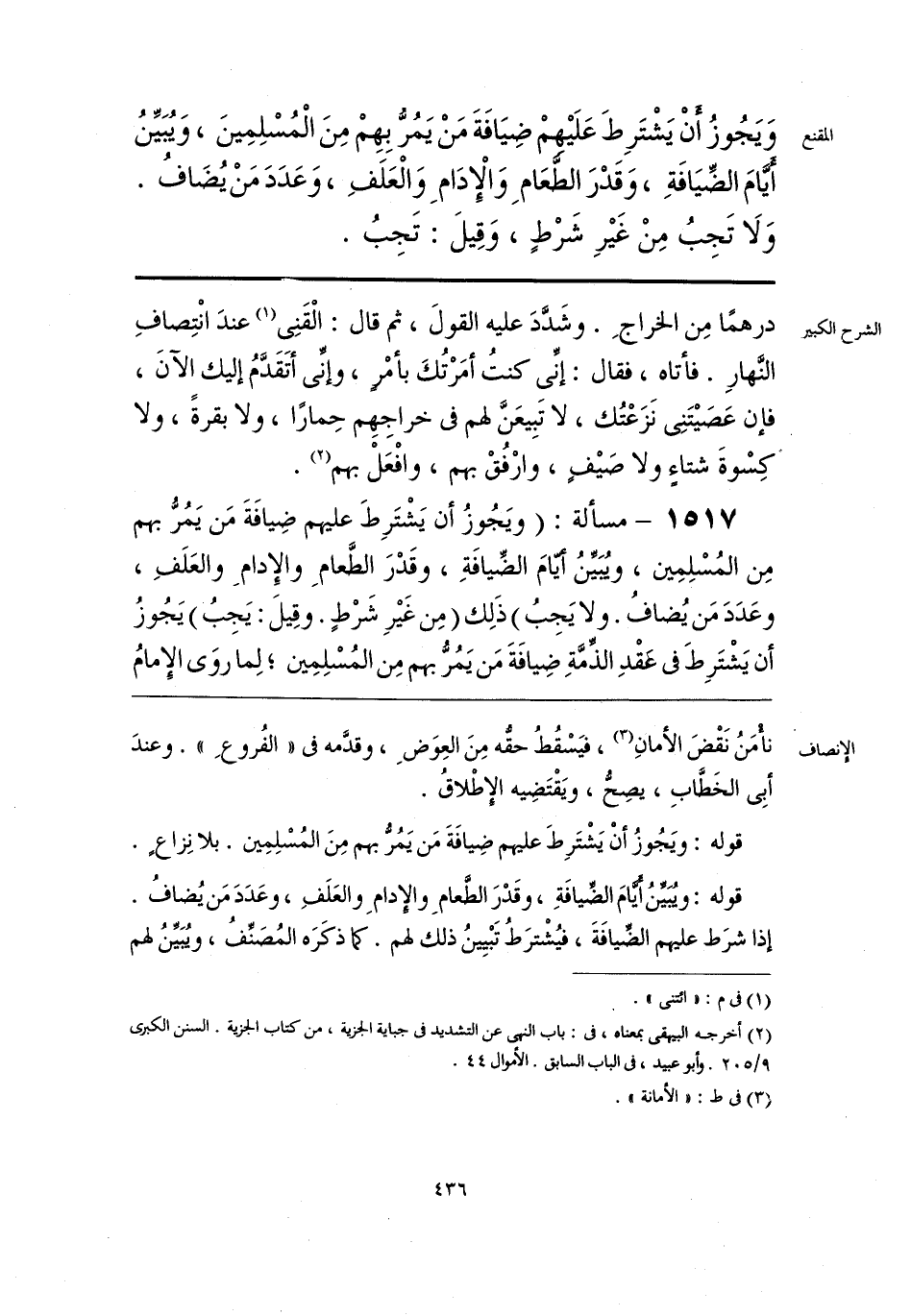 قوله: ويُبَيِّنُ أَيَّامَ الضِّيافَةِ، وقَدْرَ الطَّعامِ والإِدامِ والعَلَفِ، وعَدَدَ مَن يُضافُ. إذا شرَط عليهم الضِّيافَةَ، فيُشْترَطُ تَبْيِينُ ذلك لهم. كما ذكَرَه المُصَنِّفُ، ويُبَيِّنُ لهم