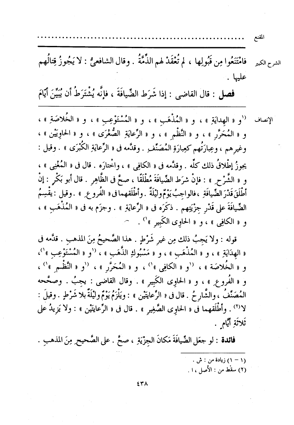 [و «الهِدايَةِ»، و «المُذْهَبِ»، و «المُسْتَوْعِبِ»، و «الخُلاصَةِ»، و «المُحَرَّرِ»، و «النَّظْمِ»، و «الرِّعايَةِ الصُّغْرَى»، و «الحاوِيَيْن»، وغيرِهم، وعِبارَتُهم كعِبارَةِ المُصَنِّفِ. وقدَّمه فى «الرِّعايَةِ الكُبْرَى». وقيل: يجوزُ إطْلاقُ ذلك كلِّه. وقدَّمه فى «الكافِى»، واخْتارَه. قال فى «المُغْنِى»، و «الشَّرْحِ»: فإنْ شرَط الضِّيافَةَ مُطْلَقًا، صحَّ فى الظَّاهِرِ. قال أبو بَكْرٍ: إنْ أطْلَقَ قَدْرَ الضِّيافَةِ، فالواجِبُ يَوْمٌ وليْلَةٌ. وأطْلَقهما فى «الفُروعِ». وقيل: يقْسِمُ الضِّيافَةَ على قَدْرِ جِزْيَتِهم. ذكَرَه فى «الرِّعايَةِ». وجزَم به فى «المُذْهَبِ»، و «الكافِى»، و «الحاوِى الكَبِيرِ»] (1).