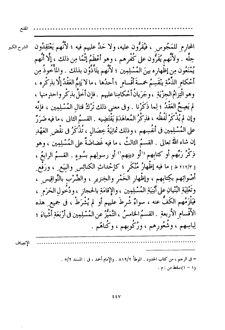 المحارِمِ للمَجُوسِ، فيُقَرُّون عليه، ولا حَدَّ عليهم فيه؛ لأنَّهم يَعْتَقِدُون حِلَّه. ولأنَّهم يُقَرُّون على كُفْرِهم، وهو أعْظَمُ إثْمًا مِن ذلك، إلَّا أنَّهم يُمْنَعُون مِن إظْهارِه بينَ المُسْلِمِين؛ لأنَّهم يتَأَذَّوْن بذلك. والمأْخُوذُ مِن أحْكامِ الذِّمَّةِ ينْقَسِمُ خمسةَ أقْسامٍ؛ أحدُها، ما لا يَتِمُّ العَقْدُ إلَّا بذِكْرِه، وهو الْتِزامُ الجِزْيَةِ، وجَرَيانُ أحْكامِنا عليهم. فإن أخَلَّ بذِكْرِ واحدٍ منها، لم يَصِحَّ العَقْدُ؛ لِما ذَكَرْنا. وفى معنى ذلك تَرْكُ قتالِ المُسْلِمِين، فإنَّه وإن لم يُذْكَرْ لَفْظُه، فذِكْرُ المُعاهَدَةِ يَقْتَضِيه. القسمُ الثانى، ما فيه ضَرَرٌ على المُسْلِمِين في أنفُسِهم، وذلك ثمانِيَةُ خِصَالٍ، تُذْكَرُ في نقْضِ العَهْدِ إن شاء اللَّهُ تعالى. القسمُ الثالثُ، ما فيه غَضاضَةٌ على المُسْلِمِين، وهو ذِكْرُ رَبِّهم أو كتابِهم [أو ديِنهم] (¬1) أو رسولِهم بسُوءٍ. القسمُ الرابعُ، ما فيه إظْهارُ مُنْكَرٍ؛ كإحْداثِ الكنائِسِ والبِيَعِ، ورَفْعِ أصْواتِهم بكِتابِهم، وإظْهارِ الخَمْرِ والخِنزيرِ، والضَّرْبِ بالنَّواقِيسِ، وتَعْلِيَةِ البُنْيانِ على أبْنِيَةِ المُسْلِمِين، والإِقامَةِ بالحجازِ، ودُخُولِ الحَرَمِ، فيَلْزَمُهم الكَفُّ عنه، سواءٌ شُرِطَ عليهم أو لم يُشْرَطْ، في جميعِ هذه الأقْسامِ الأربعةِ. القسمُ الخامسُ، التَّمَيُّزُ عن المُسْلِمِين في أرْبَعَةِ أشْياءَ؛ لِباسِهم، وشُعُورِهم، ورُكُوبِهم، وكُناهُم.