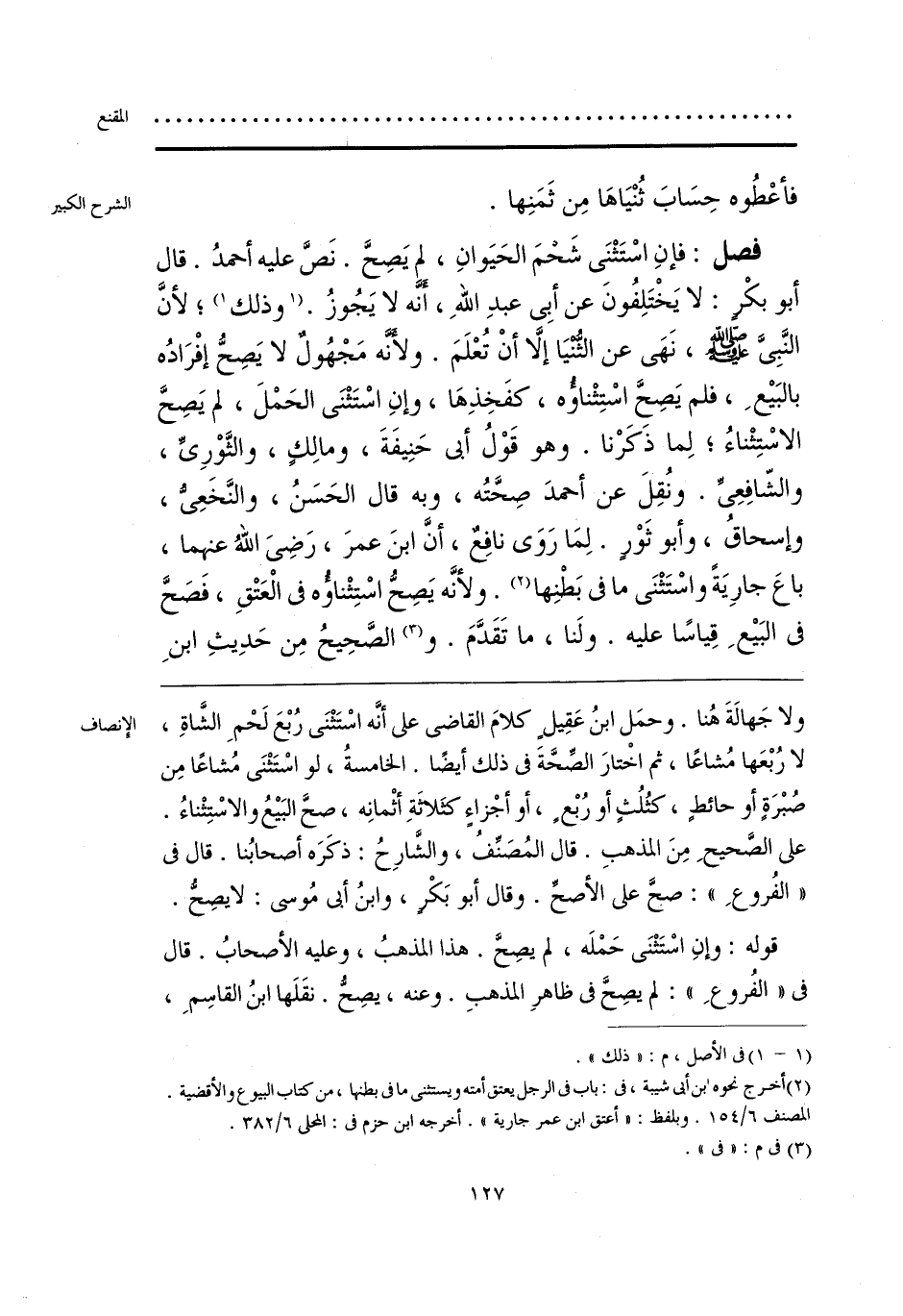 ولا جَهالَةَ هُنا. وحمَل ابنُ عَقِيلٍ كلامَ القاضى على أنَّه اسْتَثْنَى رُبْعَ لَحْمِ الشَّاةِ، لا رُبْعَها مُشاعًا، ثم اخْتارَ الصِّحَّةَ فى ذلك أَيضًا. الخامسةُ، لو اسْتَثْنَى مُشاعًا مِن صُبْرَةٍ أو حائطٍ، كثُلُثٍ أو رُبْعٍ، أو أجْزاءٍ كثَلَاثَةِ أثْمانِه، صحَّ البَيْعُ والاسْتِثْناءُ. على الصَّحيحِ مِنَ المذهبِ. قال المُصَنِّفُ، والشَّارِحُ: ذكَرَه أصحابُنا. قال فى «الفُروعِ»: صحَّ على الأصحِّ. وقال أبو بَكْرٍ، وابنُ أبى مُوسى: لا يصِحُّ.