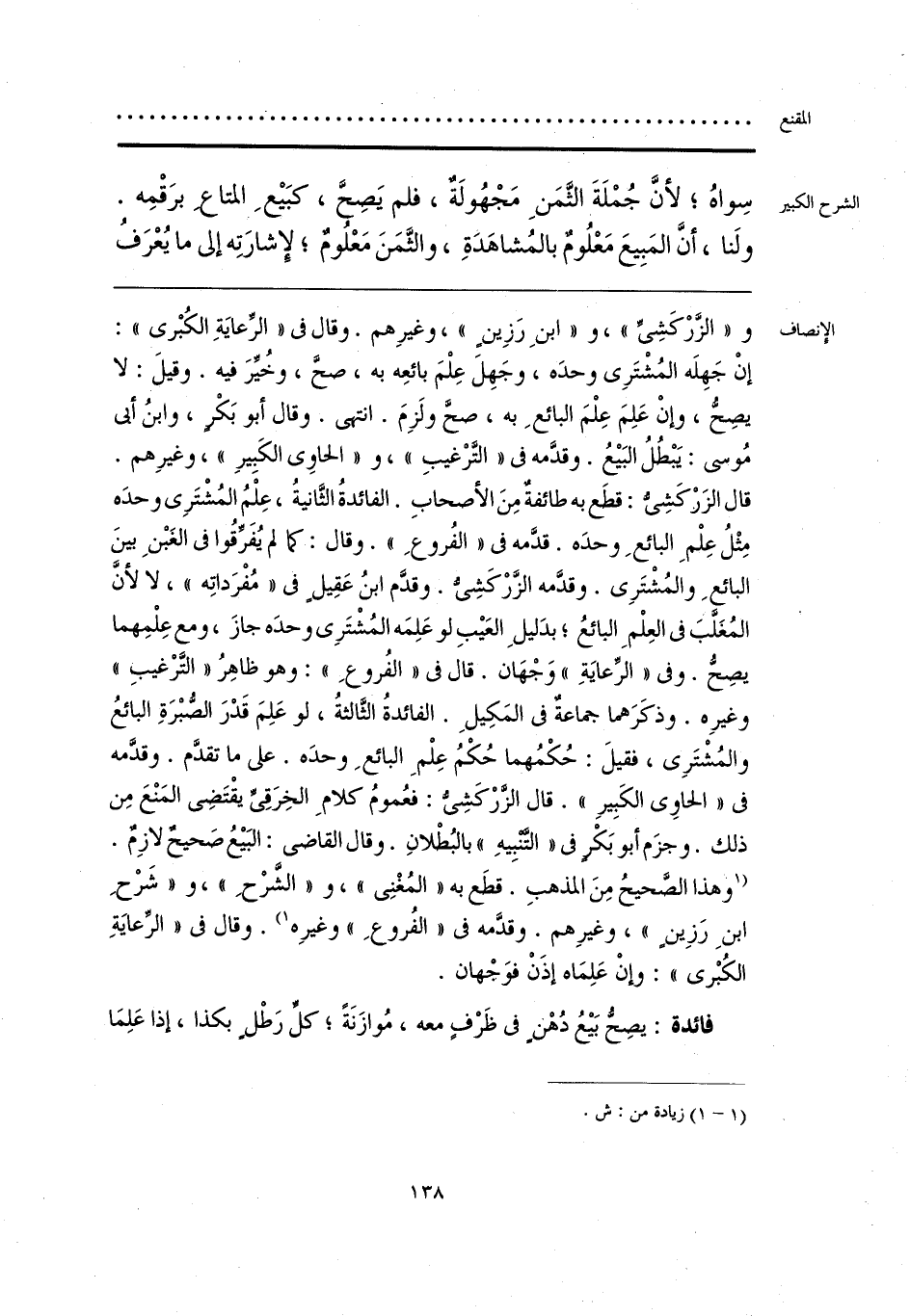 و «الزَّرْكَشِىِّ»، و «ابنِ رَزينٍ»، وغيرِهم. وقال فى «الرِّعايَةِ الكُبْرى»: إنْ جَهِلَه المُشْتَرِى وحدَه، وجَهِلَ عِلْمَ بائعِه به، صحَّ، وخُيِّرَ فيه. وقيلَ: لا يصِحُّ، وإنْ عَلِمَ عِلْمَ البائعِ به، صحَّ ولَزِمَ. انتهى. وقال أبو بَكْرٍ، وابنُ أبى مُوسى: يَبْطُلُ البَيْعُ. وقدَّمه فى «التَّرْغيبِ»، و «الحاوِى الكَبِيرِ»، وغيرِهم. قال الزركَشِىُّ: قطَع به طائفةٌ مِنَ الأصحابِ. الفائدةُ الثَّانيةُ، عِلمُ المُشْتَرِى وحدَه مِثْلُ عِلْمِ البائعِ وحدَه. قدَّمه فى «الفُروعِ». وقال: كما لم يُفرِّقُوا فى الغَبْنِ بينَ البائعِ والمُشْتَرِى. وقدَّمه الزَّرْكَشِىُّ. وقدَّم ابنُ عَقِيلٍ فى «مُفْرَداتِه»، لا لأنَّ المُغَلَّبَ فى العِلْمِ البائعُ؛ بدَليلِ العَيْبِ لو عَلِمَه المُشْتَرِى وحدَه جازَ، ومع عِلْمِهما يصِحُّ. وفى «الرِّعايَةِ» وَجْهَان. قال فى «الفُروعِ»: وهو ظاهِرُ «التَّرْغيبِ» وغيرِه. وذكَرَهما جماعةٌ فى المَكِيلِ. الفائدةُ الثَّالثةُ، لو عَلِمَ قَدْرَ الصُّبْرَةِ البائعُ والمُشْتَرِى، فقيلَ: حُكْمُهما حُكْمُ عِلْمِ البائعِ وحدَه. على ما تقدَّم. وقدَّمه فى «الحاوِى الكَبِيرِ». قال الزَّرْكَشِىُّ: فعُمومُ كلامِ الخِرَقِىِّ يقْتَضِى المَنْعَ مِن ذلك. وجزَم أبو بَكْرٍ فى «التَّنْبِيهِ» بالبُطْلانِ. وقال القاضى: البَيْعُ صَحيحٌ لازِمٌ. [وهذا الصَّحيحُ مِنَ المذهبِ. قطَع به «المُغْنِى»، و «الشَّرْحِ»، و «شَرْحِ ابنِ رَزِينٍ»، وغيرِهم. وقدَّمه فى «الفُروعِ» وغيرِه] (¬1). وقال فى «الرِّعايَةِ الكُبْرى»: وإنْ عَلِمَاه إذَنْ فوَجْهان.