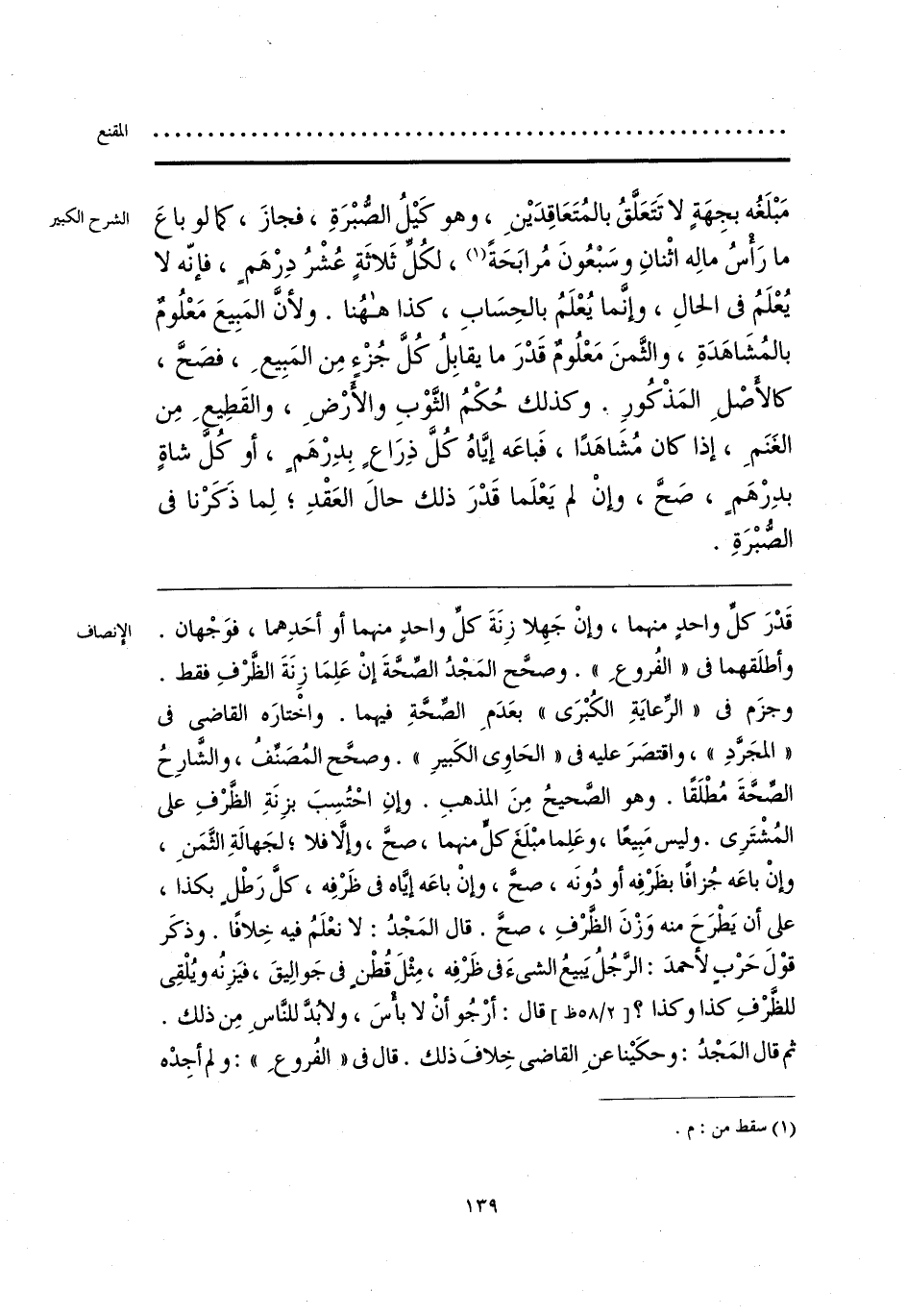 قَدْرَ كلِّ واحدٍ منهما، وإنْ جَهِلا زِنَةَ كلِّ واحدٍ منهما أو أحَدِهما، فوَجْهان. وأطلَقهما فى «الفُروعِ». وصحَّح المَجْدُ الصِّحَّةَ إنْ عَلِمَا زِنَةَ الظَّرْفِ فقط. وجزَم فى «الرِّعايَةِ الكُبْرَى» بعَدَمِ الصِّحَّةِ فيهما. واخْتارَه القاضى فى «المجَرَّدِ»، واقتصَرَ عليه فى «الحَاوِى الكَبيرِ». وصحَّح المُصَنِّفُ، والشَّارِحُ الصِّحَّةَ مُطْلَقًا. وهو الصَّحيحُ مِنَ المذهبِ. وإنِ احْتُسِبَ بزِنَةِ الظَّرْفِ على المُشْتَرِى. وليس مَبِيعًا، وعَلِما مبْلَغَ كلٍّ منهما، صحَّ، وإلَّا فلا؛ لجَهالَةِ الثَّمَنِ، وإنْ باعَه جُزافًا بظَرْفِه أو دُونَه، صحَّ، وإنْ باعَه إياه فى ظَرْفِه، كلَّ رَطْلٍ بكذا، على أن يَطْرَحَ منه وَزْنَ الظَّرْفِ، صحَّ. قال المَجْدُ: لا نعْلَمُ فيه خِلافًا. وذكَر قوْلَ حَرْبٍ لأحمدَ: الرَّجُلُ يَبيعُ الشئَ فى ظَرْفِه، مِثْلَ قُطْنٍ فى جَوالِيقَ، فيَزِنُه ويُلْقِى للظَّرْفِ كذا وكذا؟ قال: أرْجُو أَنْ لا بأْسَ، ولا بُدَّ للنَّاسِ مِن ذلك. ثم قال المَجْدُ: وحكَيْنا عنِ القاضى خِلافَ ذلك. قال فى «الفُروعِ»: ولم أجِدْه