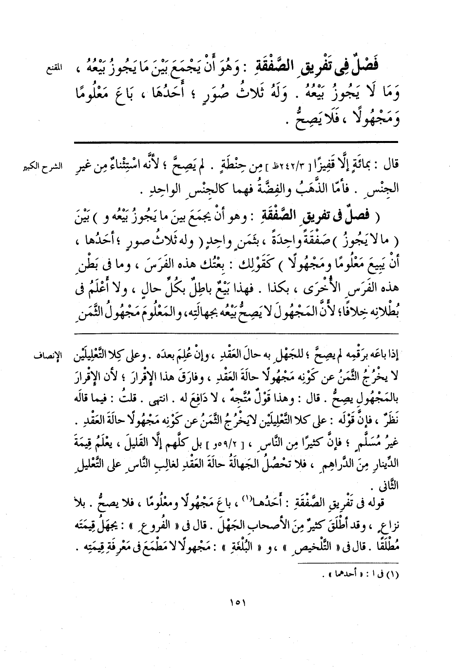 فَصْلٌ فِى تَفْريقِ الصَّفْقَةِ: وَهُوَ أَنْ يَجْمَعَ بَيْنَ مَا يَجُوزُ بَيْعُهُ، وَمَا لَا يَجُوزُ بَيْعُهُ. وَلَهُ ثَلاثُ صُوَرٍ؛ أَحَدُهَا، بَاعَ مَعْلُومًا وَمَجْهُولًا، فَلَا يَصِحُّ.