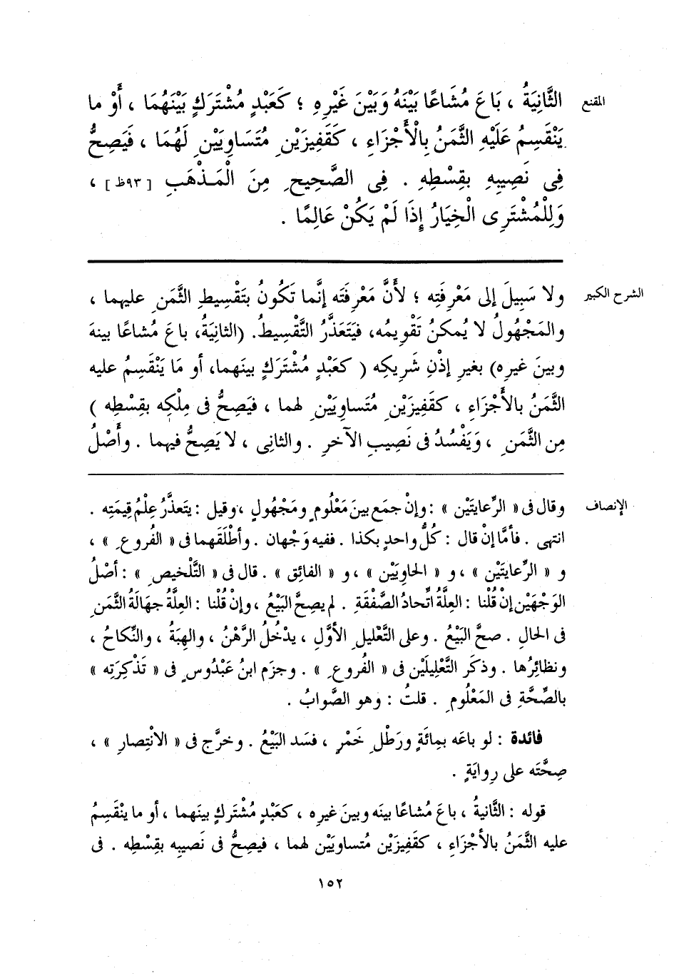 قوله: الثَّانيةُ، باعَ مُشاعًا بينَه وبينَ غيرِه، كعَبْدٍ مُشْتَركٍ بينَهما، أو ما ينْقَسِمُ عليه الثَّمَنُ بالأجْزَاءِ، كقَفِيزَيْن مُتساويَيْن لهما، فيصِحُّ فى نَصيبِه بقِسْطِه. فى