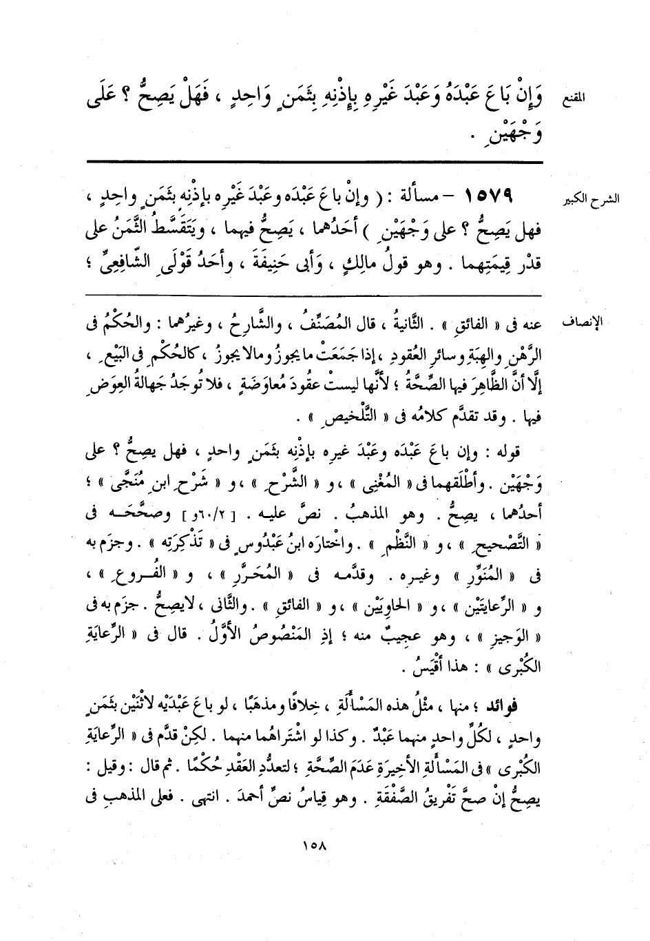 قوله: وإن باعَ عَبْدَه وعَبْدَ غيرِه بإذْنِه بثَمَن واحدٍ، فهل يصِحُّ؟ على وَجْهَيْن. وأطْلَقهما فى «المُغْنِى»، و «الشَّرْحِ»، و «شَرْحِ ابنِ مُنَجَّى»؛ أحدُهما، يصِحُّ. وهو المذهبُ. نصَّ عليه وصحَّحَه فى «التَّصْحيحِ»، و «النَّظْمِ». واخْتارَه ابنُ عَبْدُوسٍ فى «تَذْكِرَتِه». وجزَم به فى «المُنَوِّرِ» وغيره. وقدَّمه فى «المُحَرَّرِ»، و «الفُروعِ»، و «الرِّعايتَيْن»، و «الحاوِيَيْن»، و «الفائقِ». والثَّانى، لا يصِحُّ. جزَم به فى «الوَجيزِ»، وهو عجِيبٌ منه؛ إذِ المَنْصُوصُ الأوَّلُ. قال فى «الرِّعايَةِ الكُبْرى»: هذا أقْيَسُ.