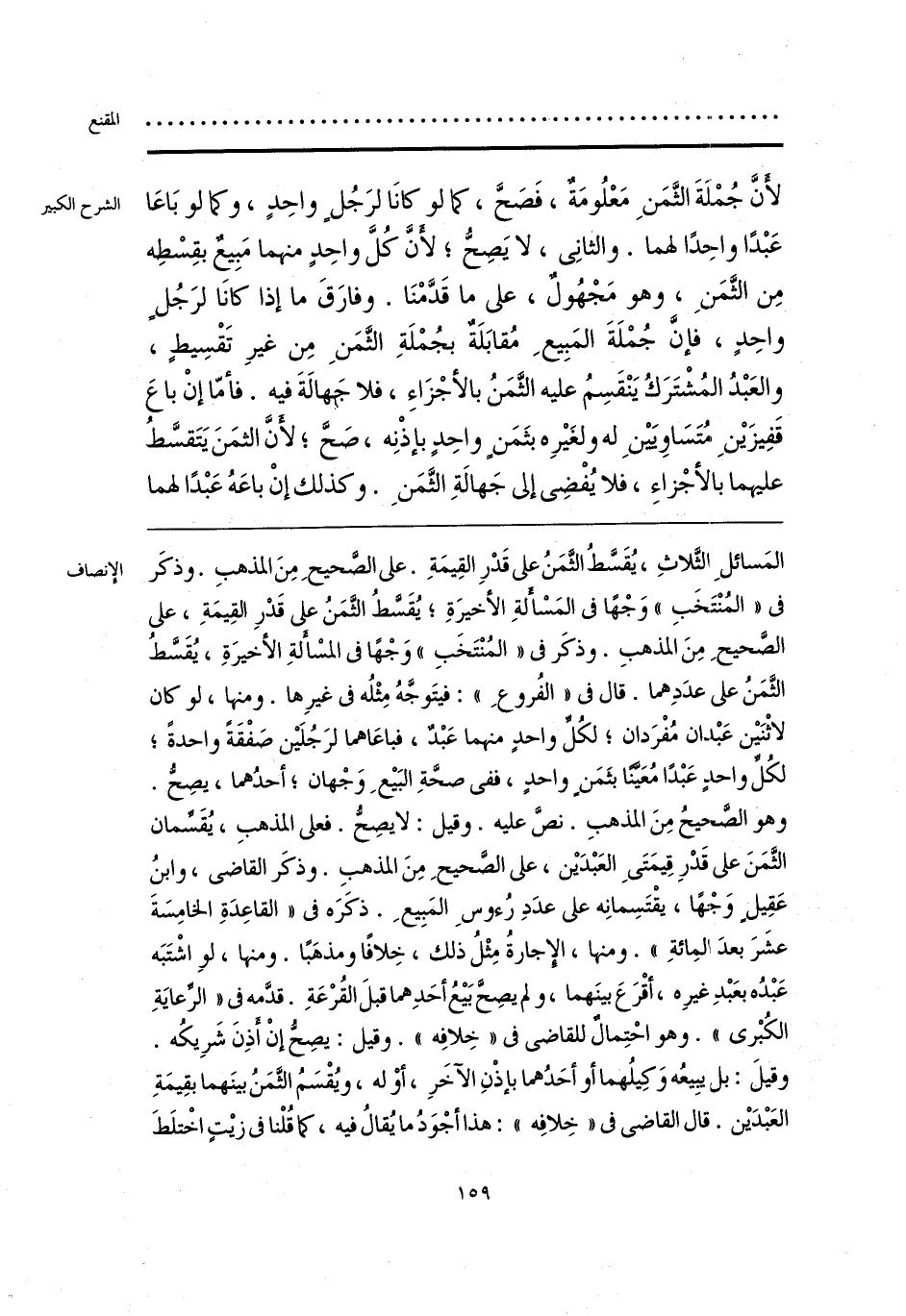 المَسائلِ الثَّلاثِ، يُقَسَّطُ الثَّمَنُ على قَدْرِ القِيمَةِ. على الصَّحيحِ مِنَ المذهبِ. وذكَر فى «المُنْتَخَبِ» وَجْهًا فى المَسْأَلةِ الأخيرَةِ؛ يُقَسَّطُ الثَّمَنُ على قَدْرِ القِيمَةِ، على الصَّحيحِ مِنَ المذهبِ. وذكَر فى «المُنْتَخَبِ» وَجْهًا فى المسْأَلةِ الأخيرَةِ، يُقَسَّطُ الثَّمَنُ على عدَدِهما. قال فى «الفُروعِ»: فيتَوجَّهُ مِثْلُه فى غيرِها. ومنها، لو كان لاثْنَيْن عَبْدان مُفْرَدان؛ لكُلِّ واحدٍ منهما عَبْدٌ، فباعَاهما لرَجُلَيْن صَفْقَة واحدةً؛ لكُلِّ واحدٍ عَبْدًا مُعَيَّنًا بثَمَنٍ واحدٍ، ففى صحَّةِ البَيْعِ وَجْهان؛ أحدُهما، يصِحُّ. وهو الصَّحيحُ مِنَ المذهبِ. نصَّ عليه. وقيل: لا يصِحُّ. فعلى المذهبِ، يُقَسِّمان الثَّمَنَ على قَدْرِ قِيمَتَىِ العَبْدَيْن، على الصَّحيحِ مِنَ المذهبِ. وذكَر القاضى، وابنُ عَقِيل وَجْهًا، يقْتَسِمانِه على عدَدِ رُءوسِ المَبِيعِ. ذكَرَه فى «القاعِدَةِ الخامِسَةَ عشَرَ بعدَ المِائةِ». ومنها، الإِجارةُ مِثْلُ ذلك، خِلافًا ومذهَبًا. ومنها، لوِ اشْتَبَه عَبْدُه بعَبْدِ غيرِه، أقْرَعَ بينَهما، ولم يصِحَّ بَيْعُ أحَدِهما قبلَ القُرْعَةِ. قدَّمه فى «الرِّعايَةِ الكُبْرى». وهو احْتِمالٌ للقاضى فى «خِلافِه». وقيل: يصِحُّ إنْ أَذِنَ شَرِيكُه. وقيلَ: بل يبِيعُه وَكِيلُهما أو أَحَدُهما بإذْنِ الآخَرِ، أَوْ له، ويُقْسَمُ الثَّمَنُ بينَهما بقِيمَةِ العَبْدَيْن. قال القاضى فى «خِلافِه»: هذا أجْوَدُ ما يُقالُ فيه، كما قُلْنا فى زيْتٍ اخْتلَطَ