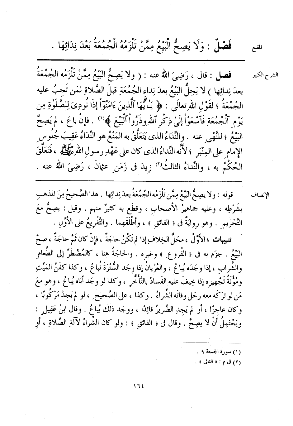 قوله: ولا يصِحُّ البَيْعُ مِمَّن تَلْزَمُه الجُمُعَةُ بعدَ نِدائِها. هذا الصَّحيحُ مِنَ المذهبِ بشَرْطِه، وعليه جماهيرُ الأصحابِ، وقطَع به كثيرٌ منهم. وقيل: يصِحُّ معَ التَّحْريمِ. وهو رِوايَةٌ فى «الفائقِ»، وأطْلَقَهما. والتَّفْرِيعُ على الأوَّلِ.