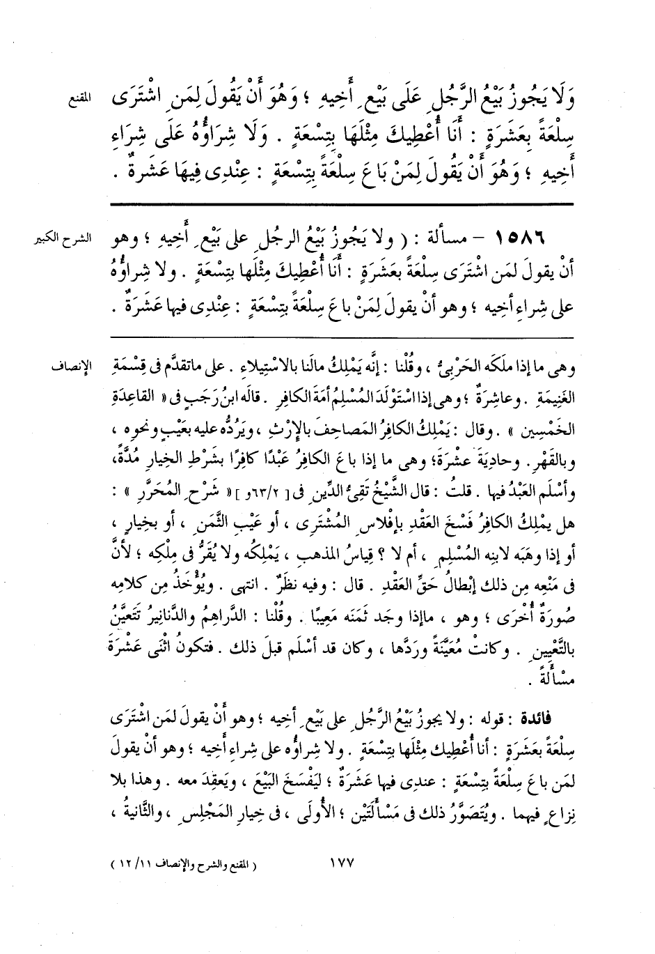 فائدة: قوله: ولا يجوزُ بَيْعُ الرَّجُلِ على بَيْعِ أخِيه؛ وهو أَنْ يقولَ لمَن اشْتَرَى سِلْعَةً بعَشَرَةٍ: أنا أُعْطِك مِثْلَها بتِسْعَةٍ. ولا شِراؤُه على شِراءِ أَخِيه؛ وهو أَنْ يقولَ لمَن باعَ سِلْعَةً بتِسْعَةٍ: عندِى فيها عَشَرَةٌ؛ ليَفْسَخَ البَيْعَ، ويَعقِدَ معه. وهذا بلا نِزاعٍ فيهما. ويُتَصَوَّرُ ذلك فى مَسْألَتَيْن؛ الأُولَى، فى خِيارِ المَجْلِسِ، والثَّانيةُ،